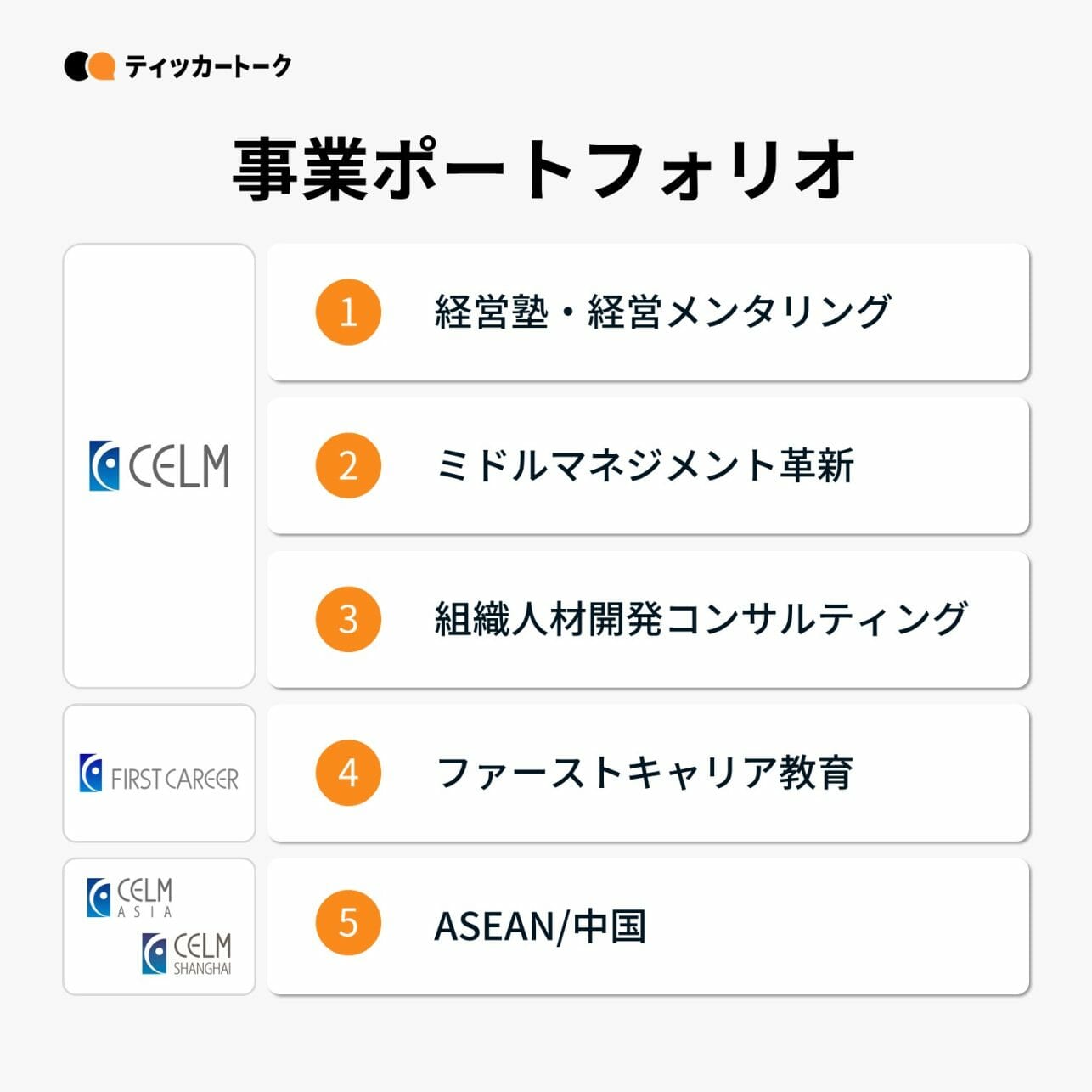 セルムの事業は、大きく5つに区分される。グループの中核である株式会社セルムは、経営層・リーダー層を対象とした「経営塾・経営メンタリング」、ミドル層を対象にトレーニングを行う「ミドルマネジメント革新」、組織全体の人材育成体系の構築などを行う「組織人材開発コンサルティング」の3つの事業を行っている。加えて、グループ会社である株式会社ファーストキャリアは内定者~若手社員を対象にした「ファーストキャリア」教育を、海外法人はASEAN/中国における人材・組織開発を行っている。