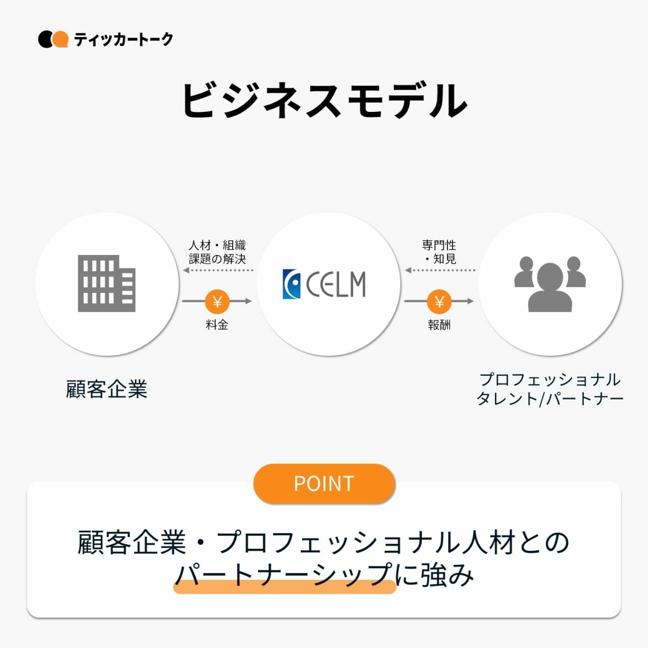 セルムのビジネスモデルは、人材開発・組織開発に関する課題を抱えた顧客企業に対して、優れた専門性・経営経験を持ったプロフェッショナルタレントを交えて中長期の課題に伴走することが特徴。あえて特定プログラムやコンサル機能を自前で持たず、プロフェッショナルタレントを用いた外部ネットワークを構築することで個社固有の課題に幅広く対応できる体制を取っている。
