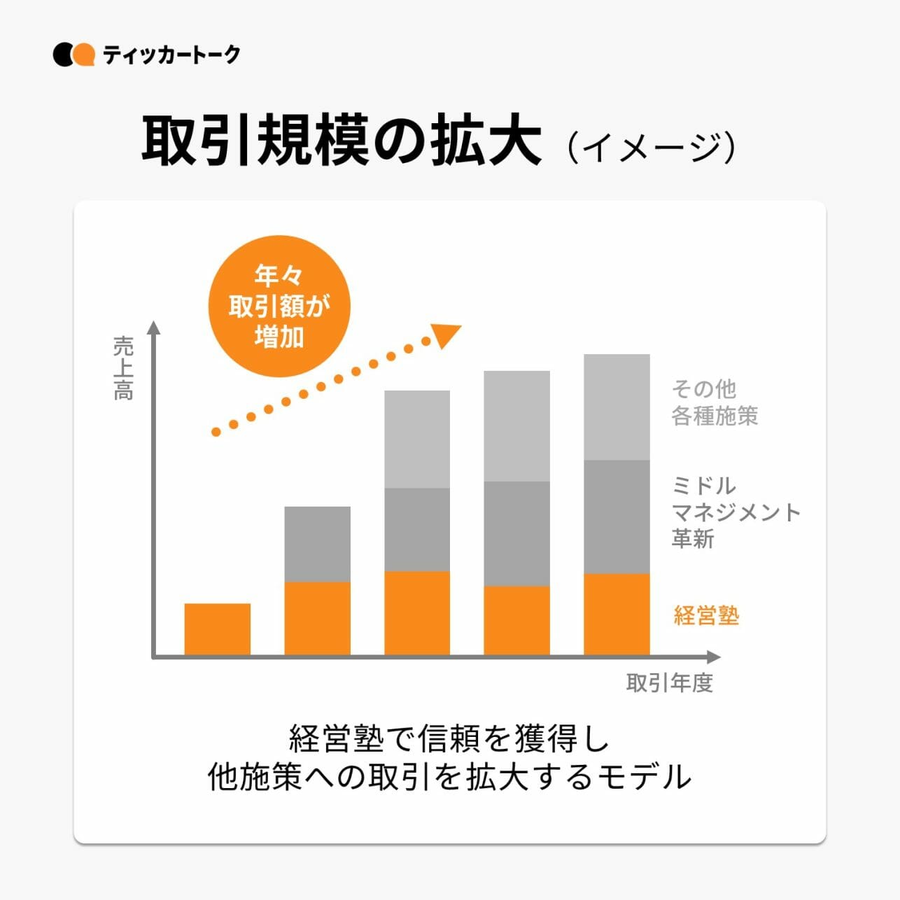 このようなネットワークを基盤として、人材開発領域の最重要テーマである経営塾で成果を上げることで顧客の信頼を獲得。ミドルマネジメント革新をはじめとした他施策に取引を広げていくことで、取引額の拡大・取引の長期化につなげている。