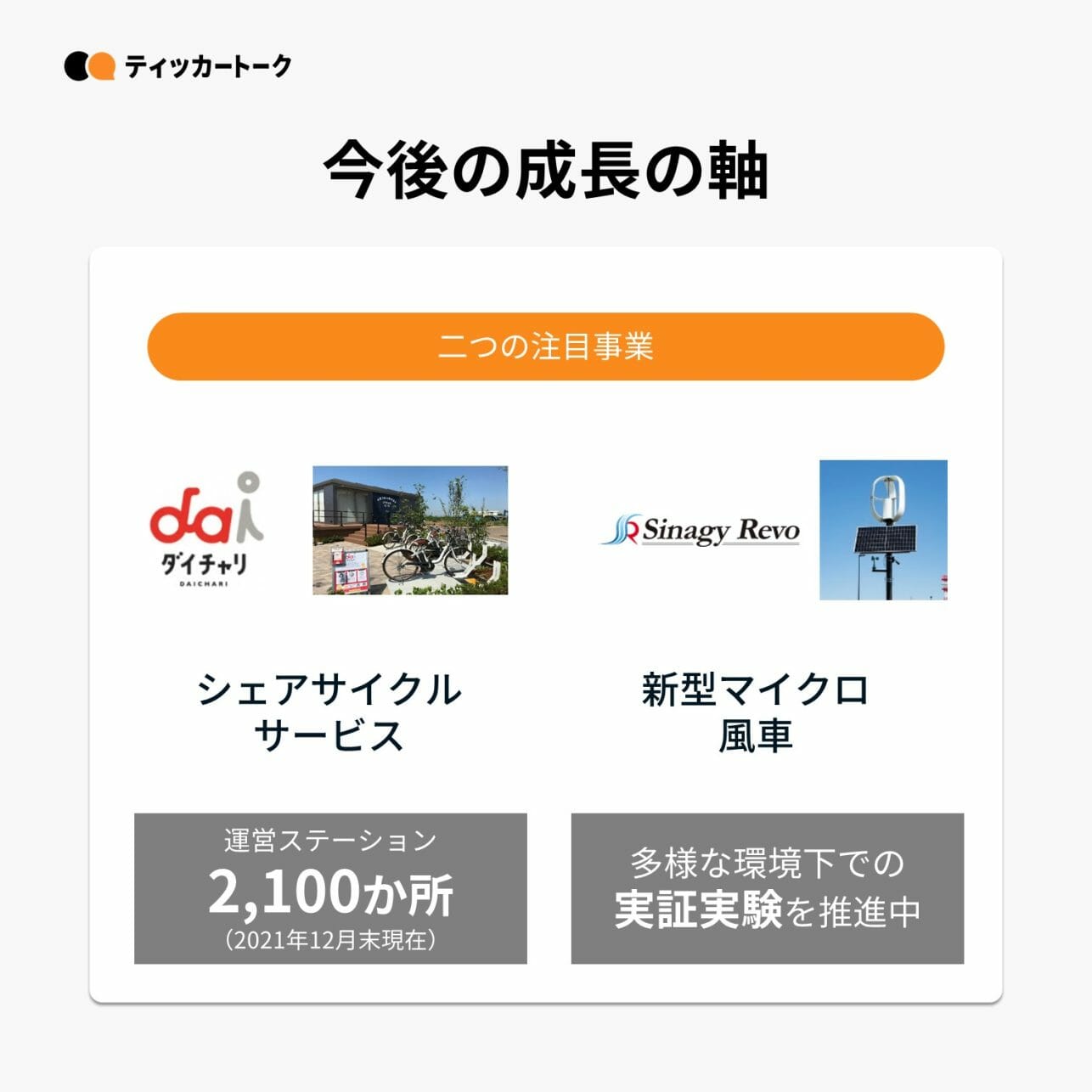 様々な領域で新規事業を展開している同社だが、中でも今後の成長が見込まれるのはシェアサイクル事業と、新型マイクロ風車の2事業。同社が手掛けるシェアサイクル「ダイチャリ」は首都圏を中心に、鉄道会社や自治体などと連携しステーション開発を推進中。新型マイクロ風車も、発電効率・静穏性・安全性に優れることから大きな注目を集めている。