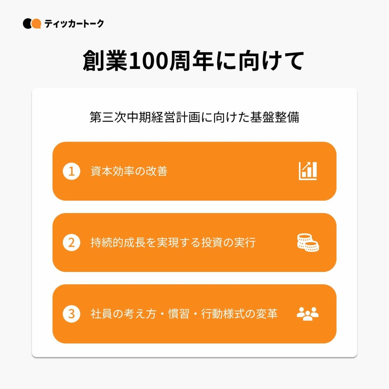 現行の第二次中期経営計画は、第三次中期経営計画での躍進に向けた基礎固めと位置づけ、3つの変革を定性目標として取り組みを推進している。