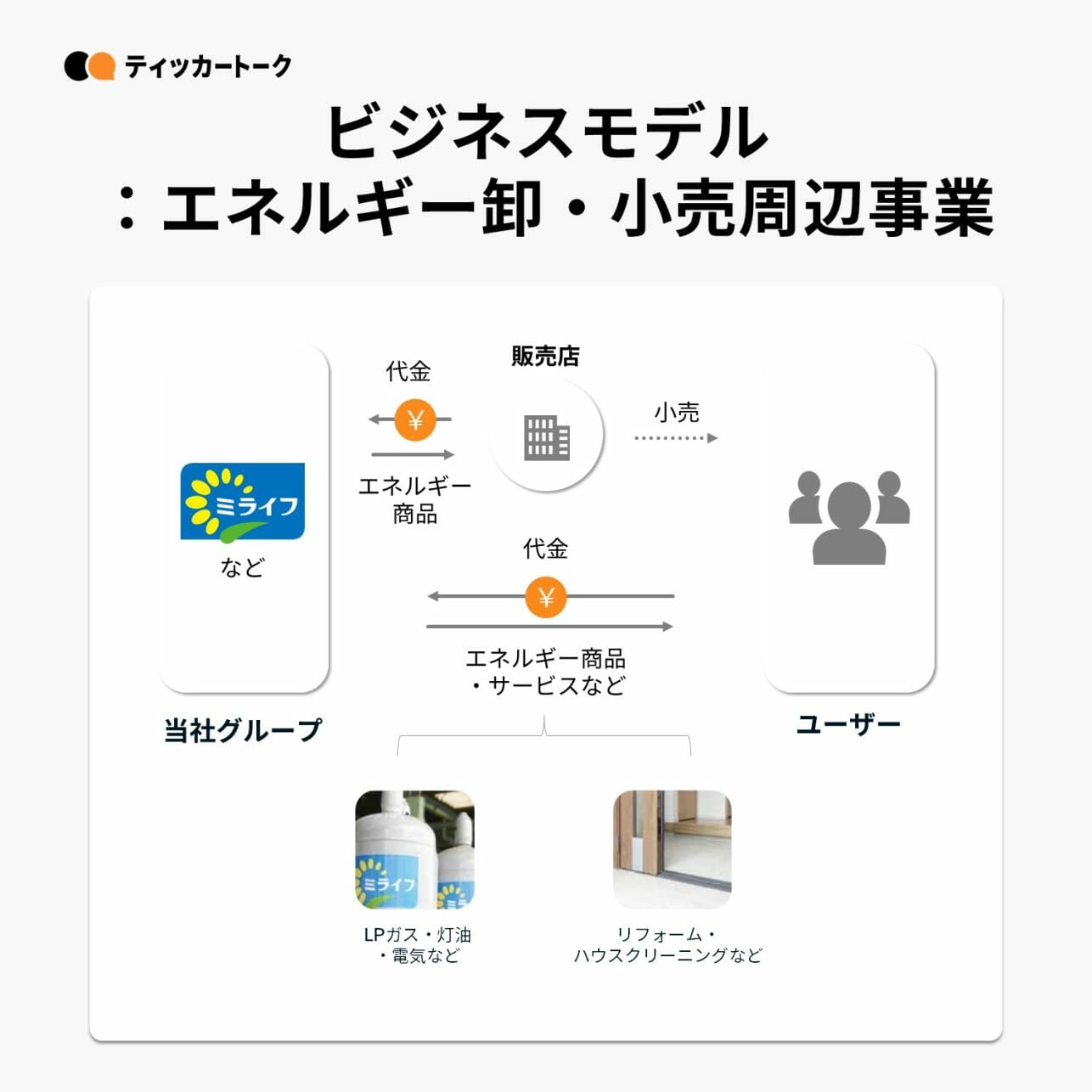 エネルギー卸・小売周辺事業は、LPガス・灯油・電気、都市ガスなどのエネルギーの供給に加え、リフォームや省エネ機器販売を通して消費者に快適な暮らしを提供するBtoCの事業。直販に加え、地域の販売店経由の卸売を軸とする約70万世帯の顧客基盤を構築。グループ会社であるミライフ株式会社等のもと、関西・東海圏から関東・東北・北海道まで約100拠点を展開し、地域密着型のサービスを提供している。