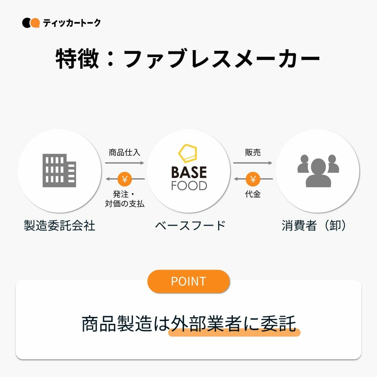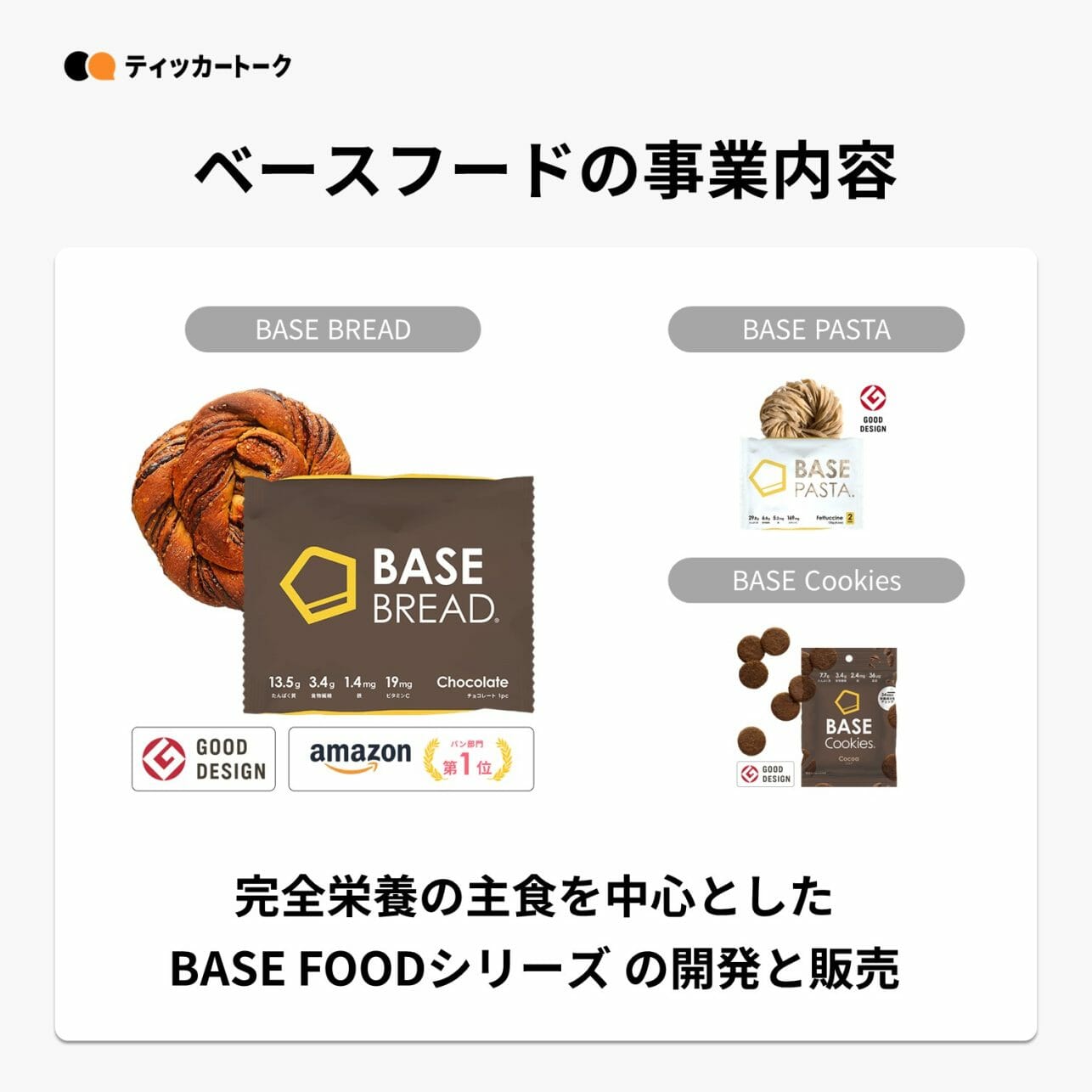 完全栄養の主食を中心としたBASE FOODシリーズ(「BASE PASTA」・「BASE BREAD」・「BASE Cookies」)の開発と販売を行なっている。低脂質、低糖質、低塩分で、たんぱく質、食物繊維、ビタミン、ミネラルなど1日に必要な約30種類の栄養素が含まれ、必要な栄養素がバランスよく摂れる点が特徴。