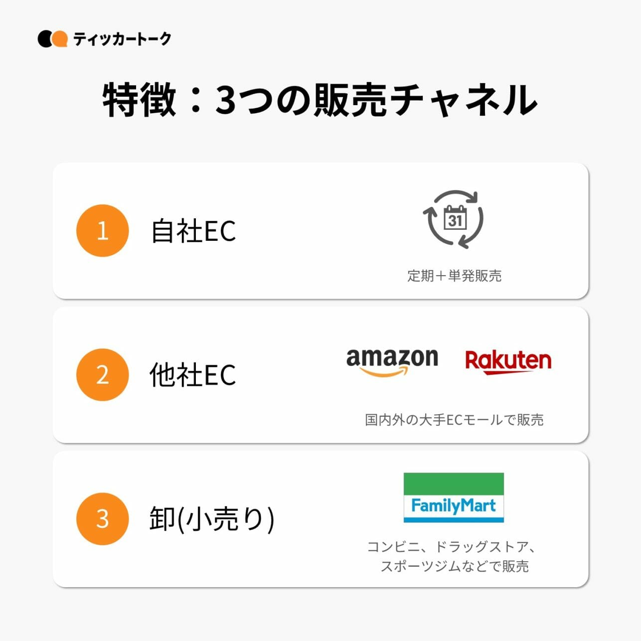 ❶サブスクリプション型の定期販売を含む自社ECでの直接販売、❷Amazonや楽天などの大手モールをはじめとした他社ECを経由してのセット販売、❸コンビニやスポーツジムなど実店舗での卸販売の3つのチャネルで商品を販売。