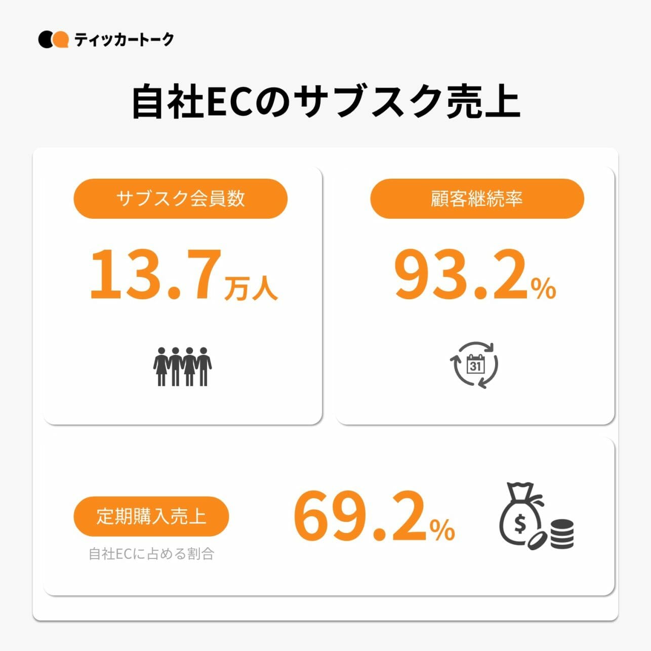 2022年8月時点での自社ECにおけるサブスクリプション会員数は137,620人、顧客継続率は93.2%となっている。2022年2月期実績では、自社ECにおける売上高の69.2%は定期購入顧客から発生。