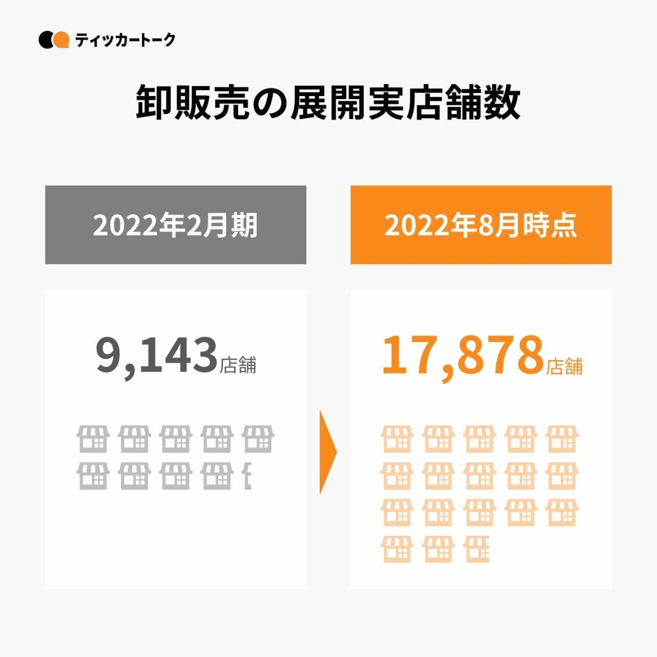 卸販売においては、コンビニエンスストアやドラッグストアなどオフラインでの販売店舗が順調に拡大し、2022年8月時点で展開実店舗数は、17,878店舗(前事業年度末は、9,143店舗)まで拡大。全国の実店舗で買いたい時に1袋から手軽に購入することができるようになっており、オンラインでリーチできなかった顧客に対して、オフラインでの商品の認知および商品体験の拡大を行なっている。