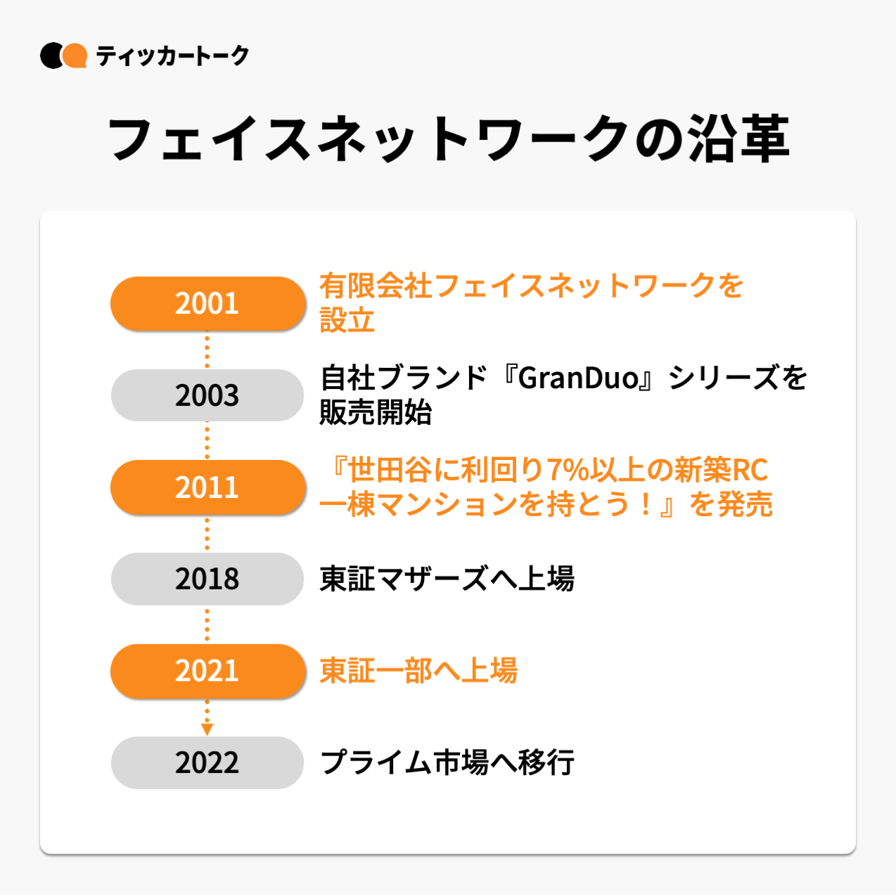 2001年、世田谷区にて設立し、2003年に自社ブランドとなる『GranDuoシリーズ』の販売を開始した。その後、書籍『世田谷に利回り7%以上の新築RC一棟マンションを持とう!』の発刊や中古一棟ビルリノベーションの自社ブランドである『GrandStoryシリーズ』の販売を開始。2018年に東証マザーズへ上場し、2021年東証一部(現:東証プライム市場)へ上場を果たしている。