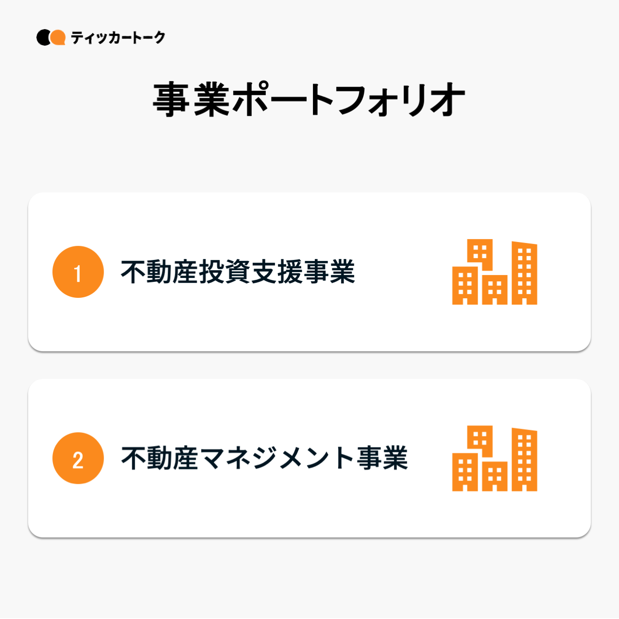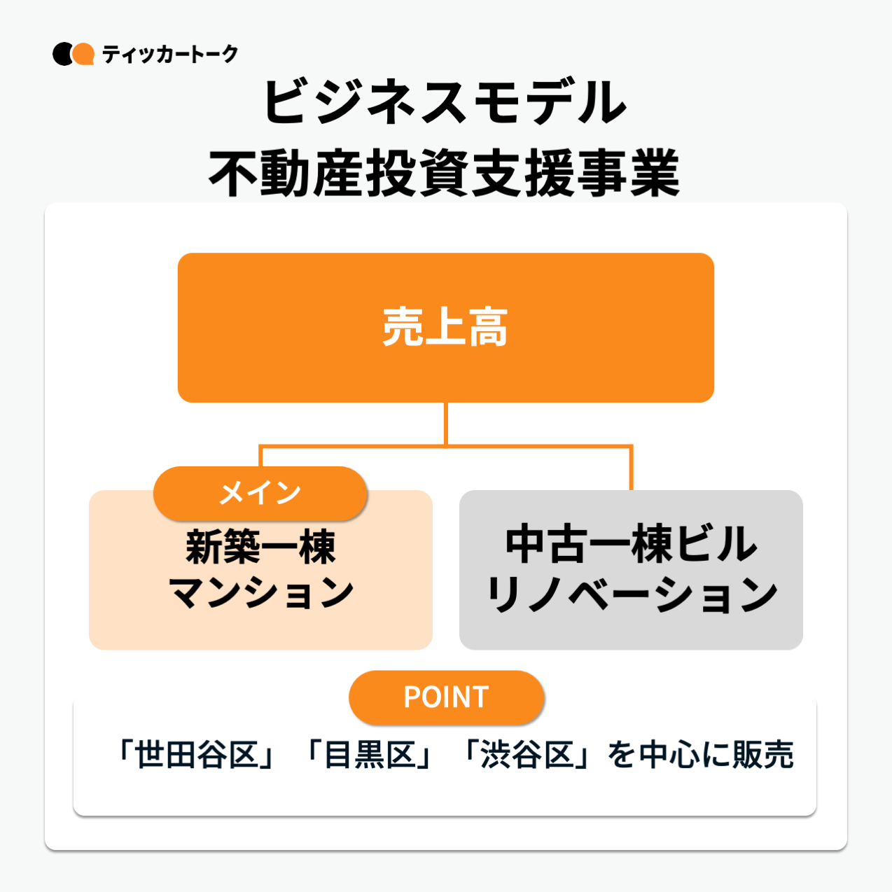 メイン事業となる不動産投資支援事業は、主に新築一棟RCマンションの販売や中古一棟ビルのリノベーションを行っている。立地条件が整った城南3区(「世田谷区」「目黒区」「渋谷区」)を中心に事業を展開している。また①土地仕入、②設計、③施工、④賃貸募集、⑤物件管理、⑥販売までの全ての工程を自社で行うことにより、中間マージンを不要とし、不動産オーナーへの利益を最大化するワンストップサービスを採用し、物件を提供している。