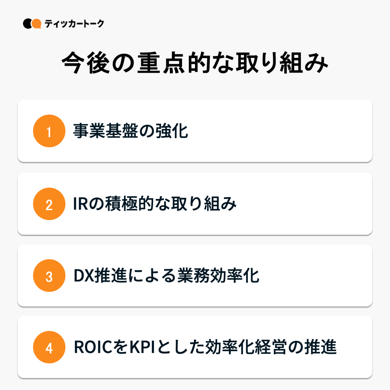 フェイスネットワークは今後のさらなる成長のため、①事業基盤の強化、②IRの積極的な取り組み、③DX推進による業務の効率化、④ROICをKPIとした効率化経営の推進を掲げている。これらの取り組みは、売上高・営業利益の継続的な成長を果たし、株式市場において自社の企業価値を確立するための取り組みである。