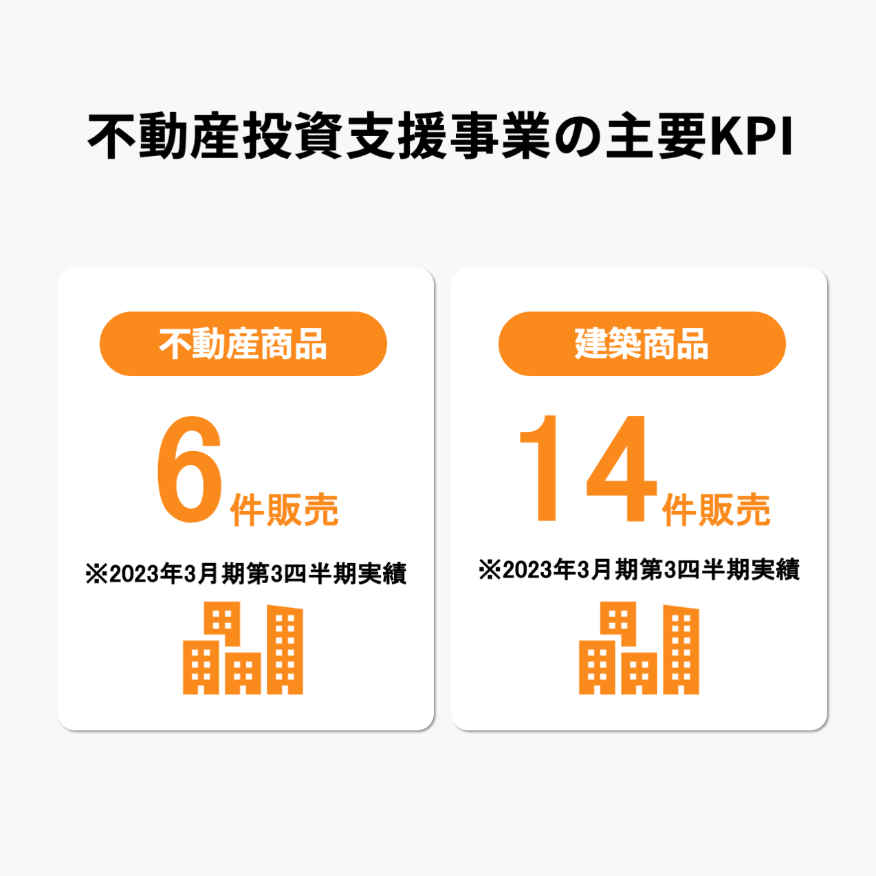フェイスネットワークは収益の柱となっている不動産投資支援事業において、不動産商品の販売数と建築商品の販売数を主要KPIとしている。2023年3月期第3四半期の実績としては不動産商品は6件、建築商品は14件の販売実績となっている。