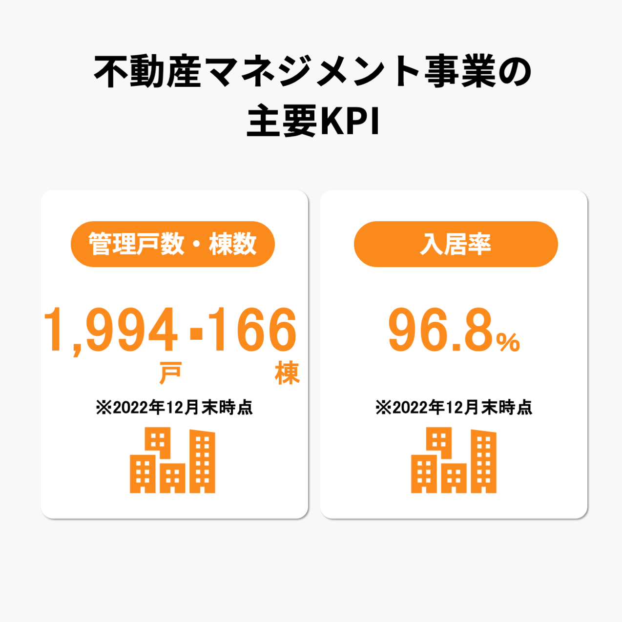 不動産マネジメント事業の主要KPIは管理戸数・棟数、入居率となっている。2022年12月末時点では管理戸数は1,994戸、棟数は166棟、入居率は96.8%となっている。