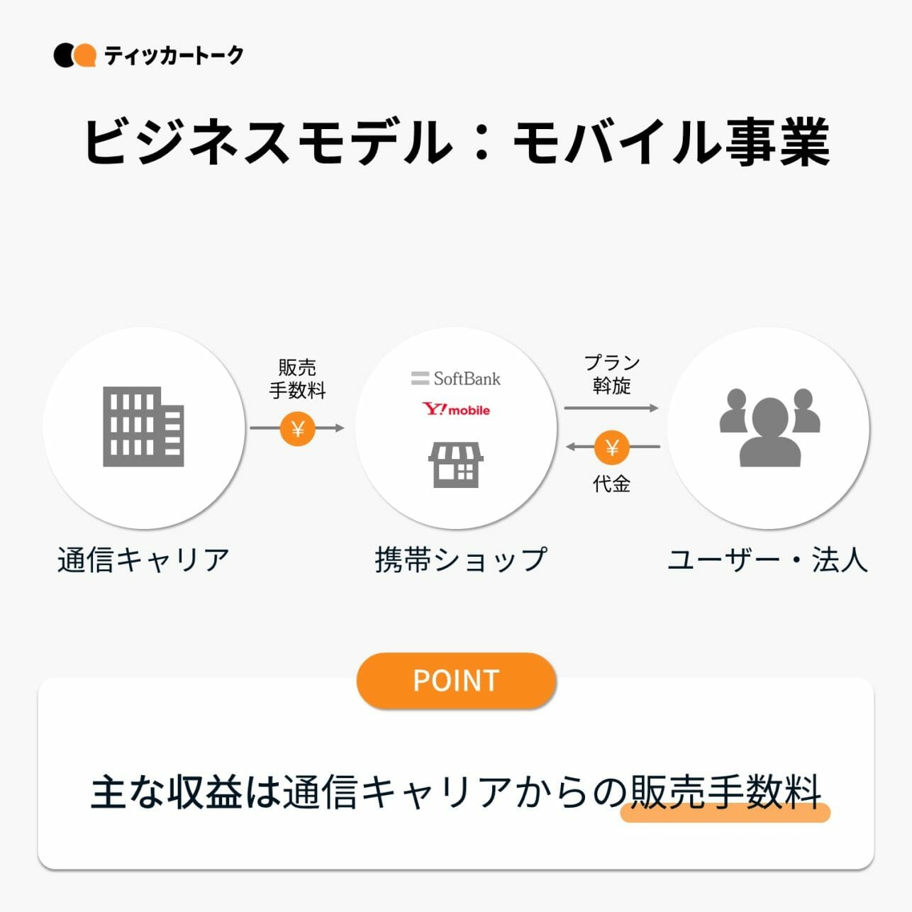 最大の収益柱であるモバイル事業は全国に510店舗20194月時点ある携帯キャリアショップにおいて一般消費者向けに通信プランとセットでスマホを販売し通信キャリア各社から販売手数料を得る仕組み法人を対象としたモバイル周辺機器の販売も行っている