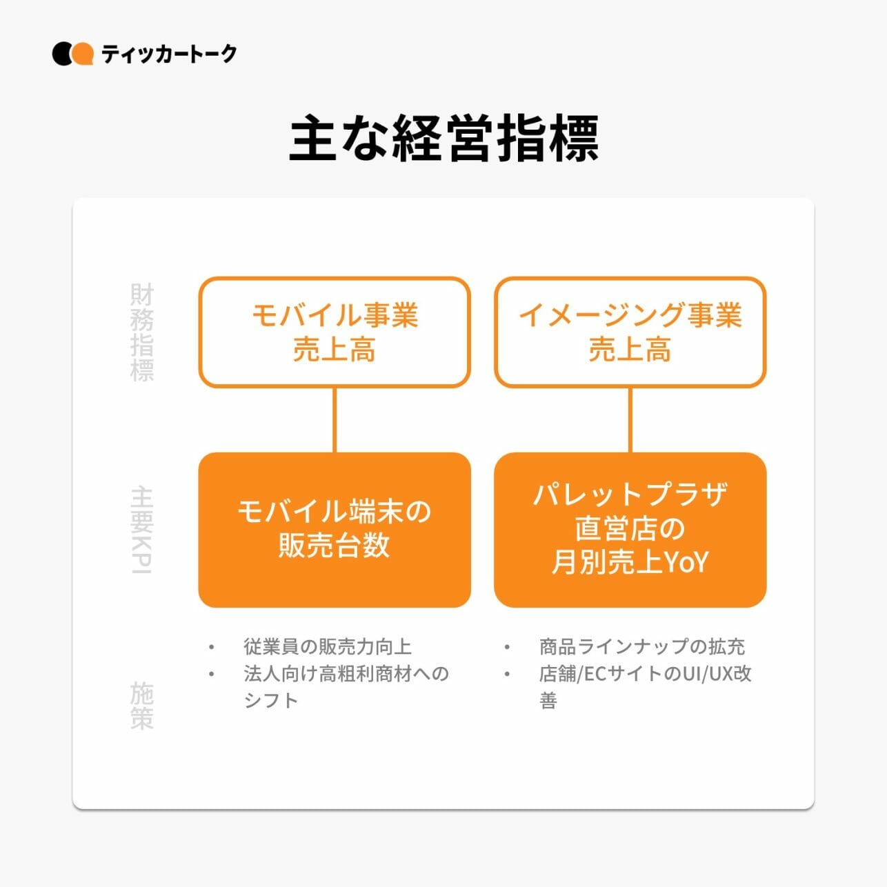 経営を評価する指標としてはモバイル事業ではモバイル端末の販売台数イメージング事業ではパレットプラザ直営店の月別売上YoYを置いているイメージング事業に関しては20219月時点で店舗の95%がフランチャイズ化しているものの直営として残している旗艦店の売上を業績評価のKPIとして置いている状況