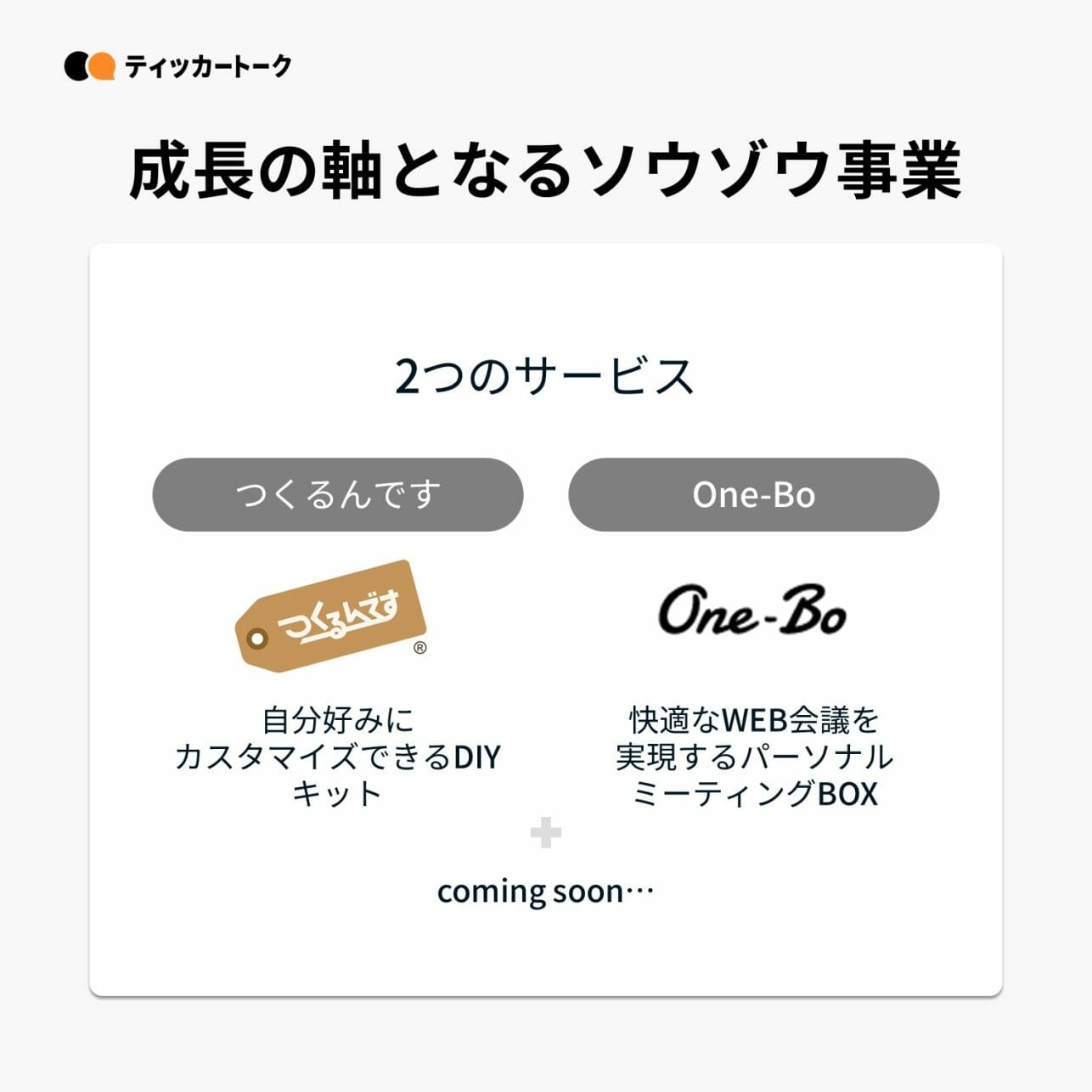 3本目の柱を作るべく2020年には新規事業開発に特化したソウゾウ事業本部を設立つくる楽しさ一生もんをコンセプトに生まれたDIYキットブランドつくるんですZoom日本法人であるZVC Japan株式会社と共同企画したオンライン会議のための”個室空間”One-Boワンボなど社内資産を活用しながら新たな領域を開拓している
