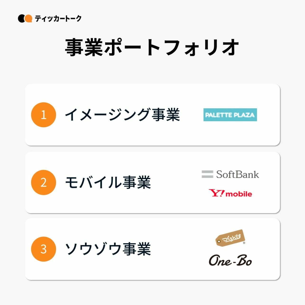 事業は携帯電話ショップを主とするモバイル事業とフォトサービスショップパレットプラザの運営をはじめとしたイメージング事業が主な売上の柱になっているまた2020年に設立したソウゾウ事業本部が推し進めるソウゾウ事業も伸長中