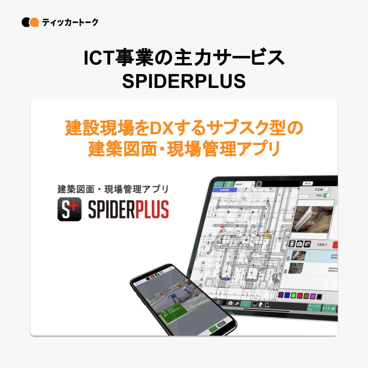 スパイダープラスは建設業をDXする会社を目指し、創業時から取り組むエンジニア事業に加え、ICT事業にも注力している。スパイダープラスが提供する図面管理アプリ「SPIDER PLUS」を主力とし、建設業界の現場をITでサポートする事業を展開している。