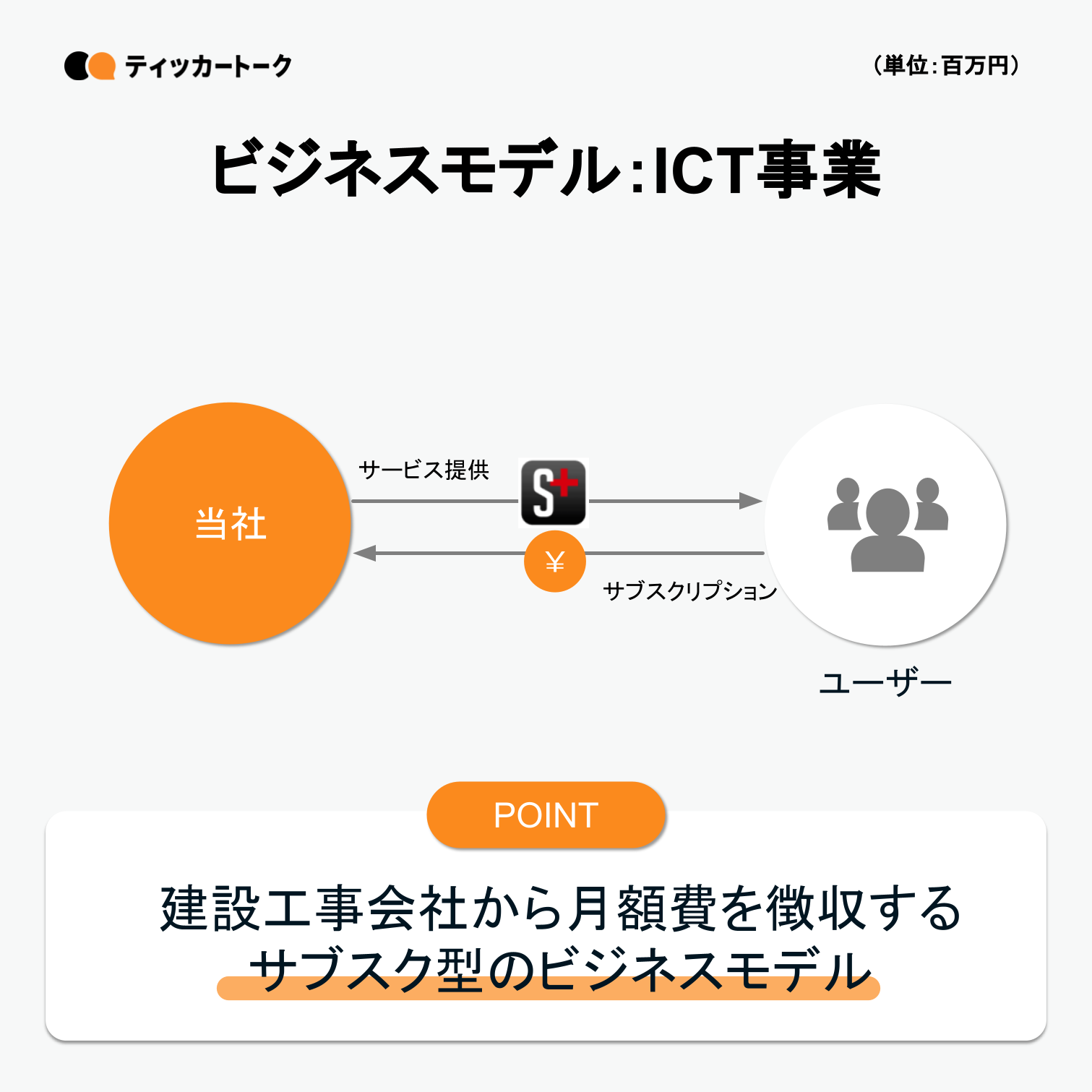 主力の収益事業であるICT事業は、建設現場にサービスを提供し、月額利用料を収益化するビジネスモデル。図面・写真・検査記録などをクラウドにて一元管理をするアプリケーションを提供している。