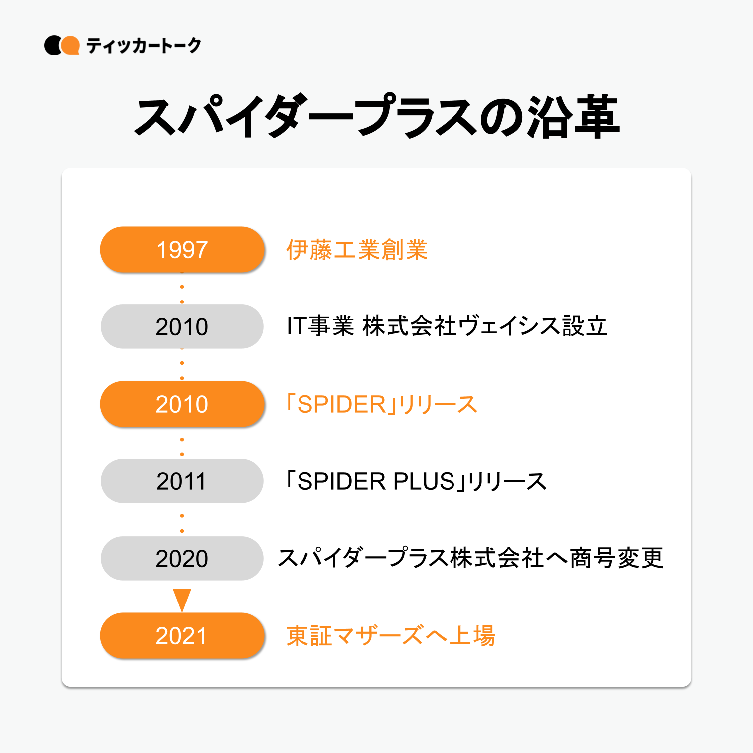 1997年に建設会社として伊藤工業を創業。2001年に株式会社へ組織変更し、2010年「SPIDER」を基盤にIT事業に参入。2011年に「SPIDER PLUS」をリリースし、ICT事業を軸に規模を拡大し、2021年5月に東証マザーズへ上場を果たす。