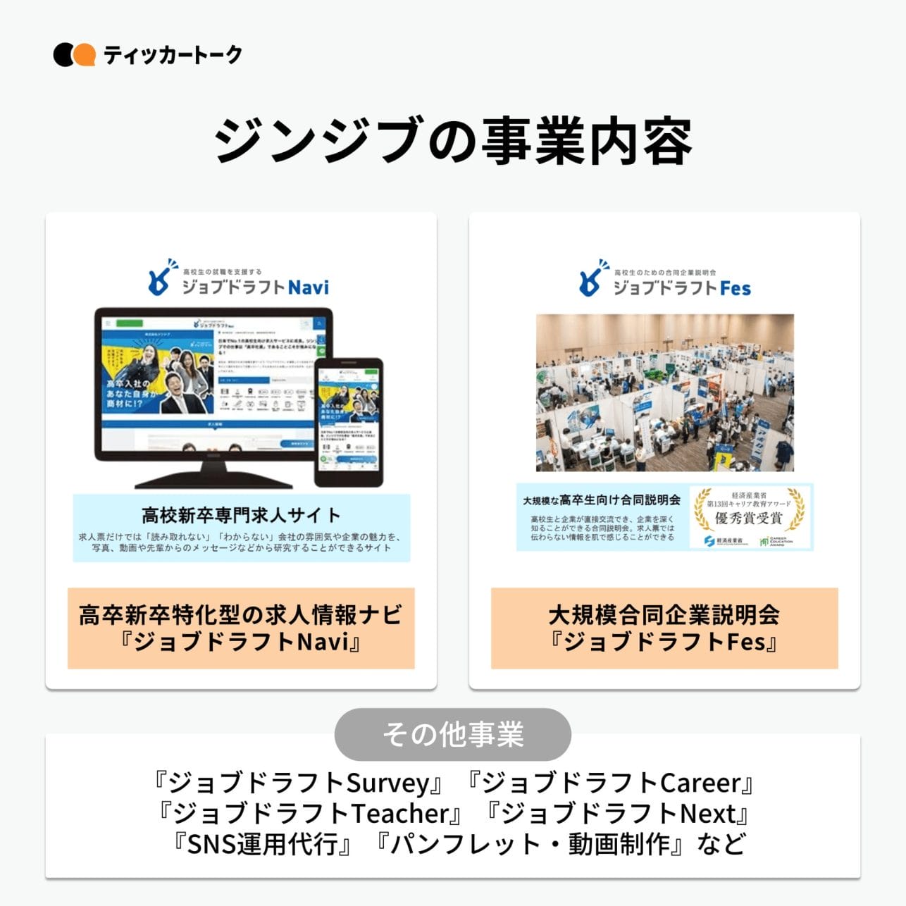 高校生の就職支援サービスとして、高卒新卒特化型の求人情報ナビの「ジョブドラフトNavi」、大規模合同企業説明会の「ジョブドラフトFes」、適性検査アプリの「ジョブドラフトSurvey」、高校生向けのキャリア教育「ジョブドラフトCareer」、高校現場の就活指導をDX化する「ジョブドラフトTeacher」、高卒第二新卒向けの人材紹介サービス「ジョブドラフトNext」を展開しています。また、企業の魅力訴求力向上を目的にSNS運用代行やパンフレット・動画制作を、採用業務効率化を目的に種々代行サービスを提供しております。その他、社会人基礎スキルやマインド、DXを始めとしたスキル研修も提供しています。