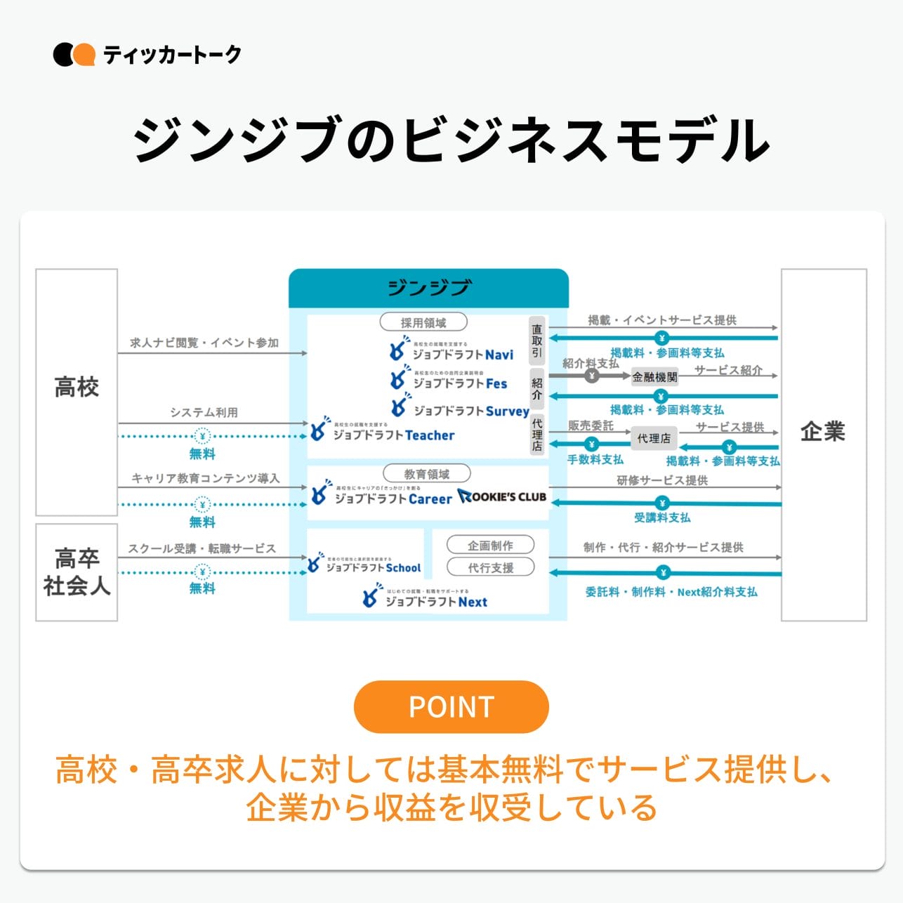 当社のビジネスモデルとして、高卒人材特化型の求人情報を掲載する「ジョブドラフトNavi」による年間掲載料を中心に、イベントの参画料、企画制作・代行支援サービスの委託料、研修サービスの受講料、人材紹介サービスの紹介料を、企業側から頂いております。
