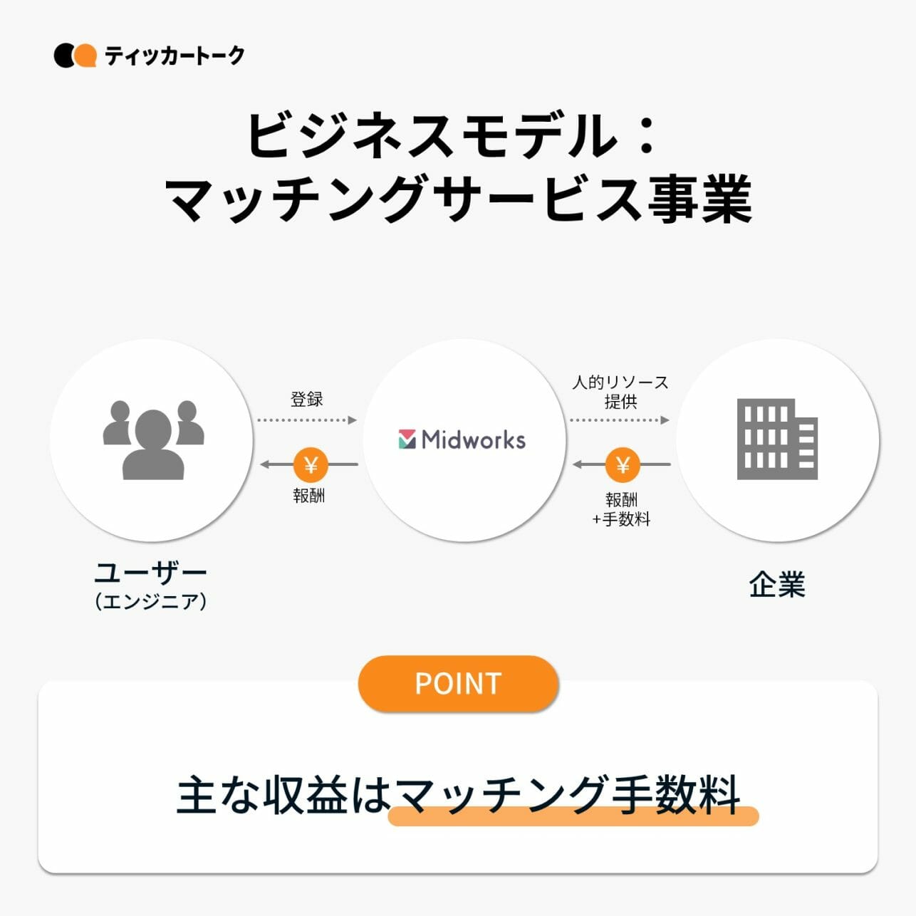 Midworksは、仕事を求めているITエンジニアとDX推進ニーズを持つ企業とを結びつけ、手数料によって収益を得るビジネスモデル。保有する案件の数とバリエーションの多さに加え、エンジニアの新しい働き方をサポートする各種のサポートで支持を集めている。