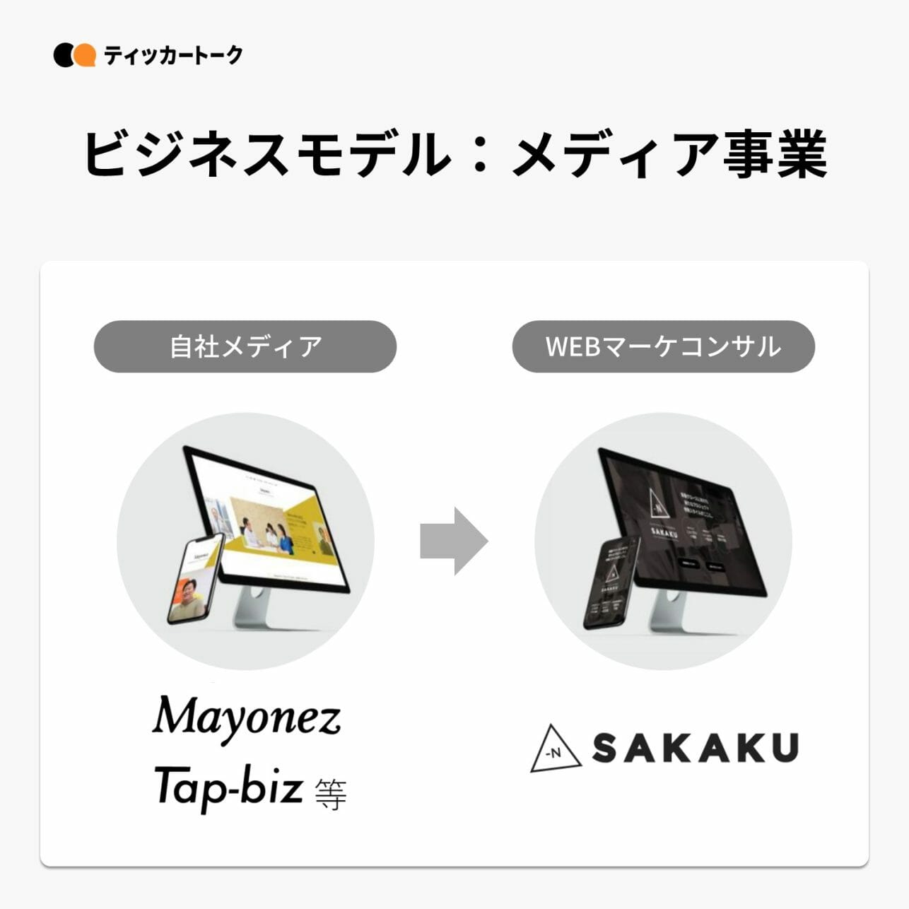 メディア事業は、運営する自社メディアである「Mayonez」「Tap-biz」から獲得したWEBマーケティングノウハウを活用し、企業にWEBマーケティングコンサルサービス「SAKAKU」を提供するビジネスモデル。