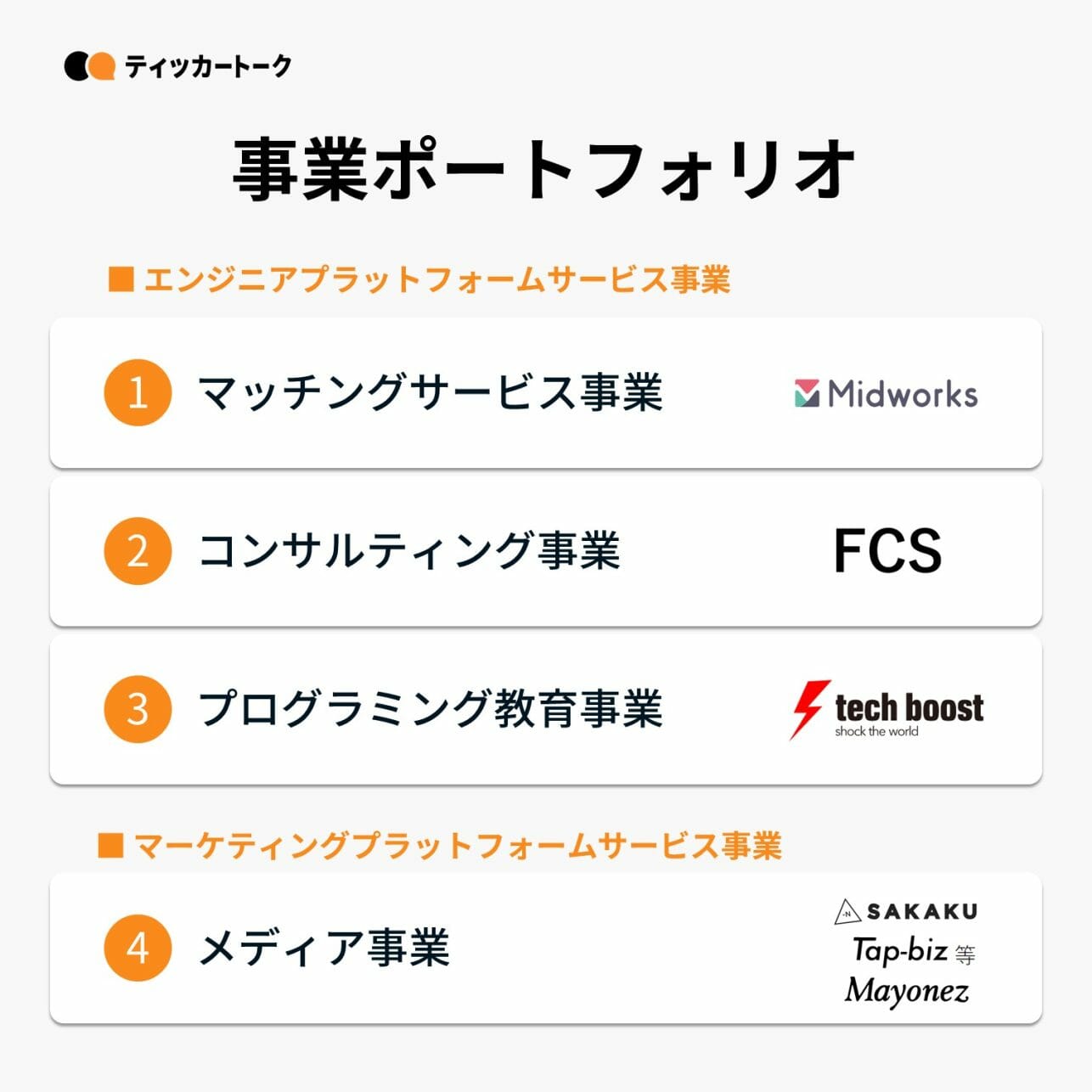 豊富なIT人材データベースを活かした3つの「エンジニアプラットフォームサービス事業」と、自社メディアの運営を軸とした「マーケティングプラットフォームサービス事業」の計4つの事業を展開している。