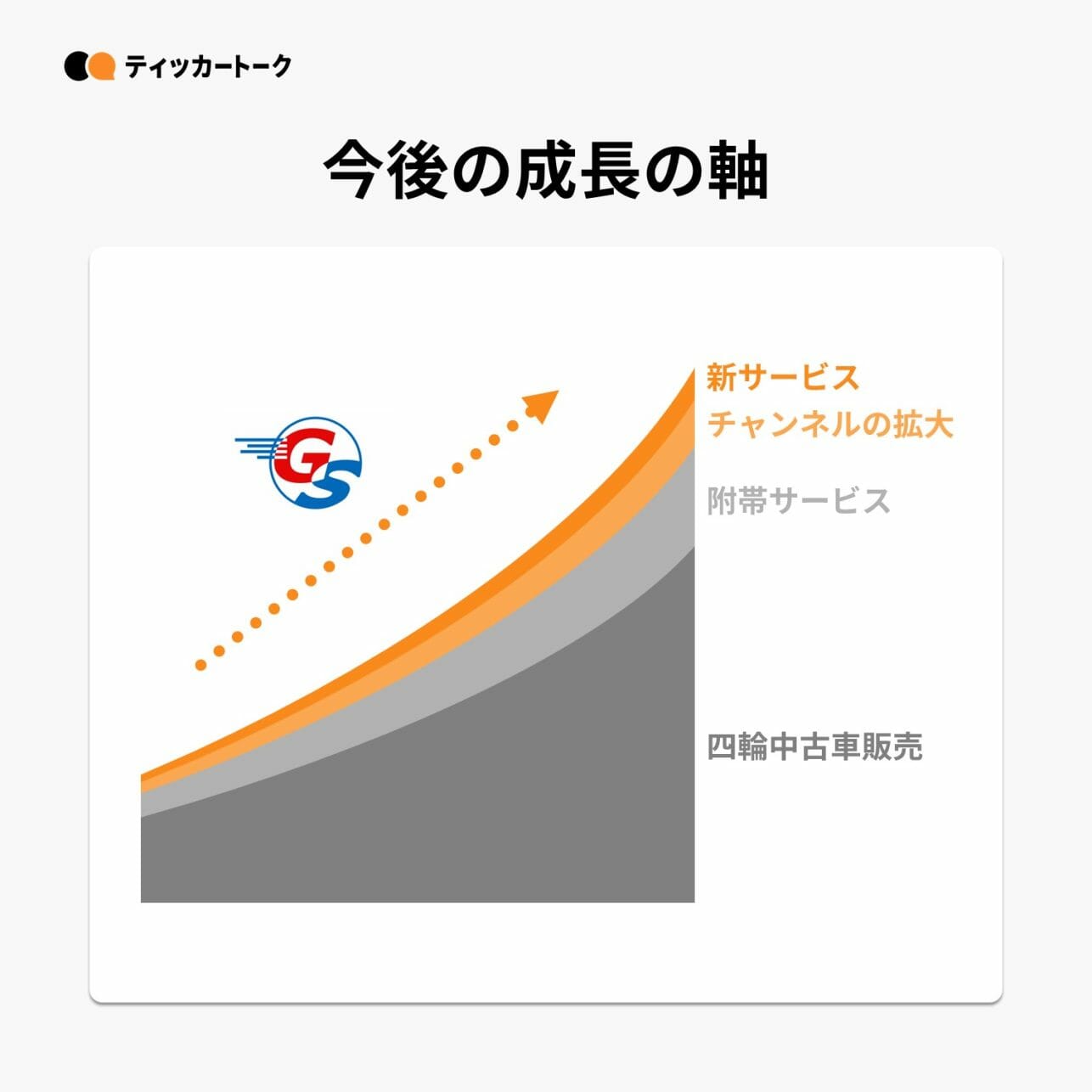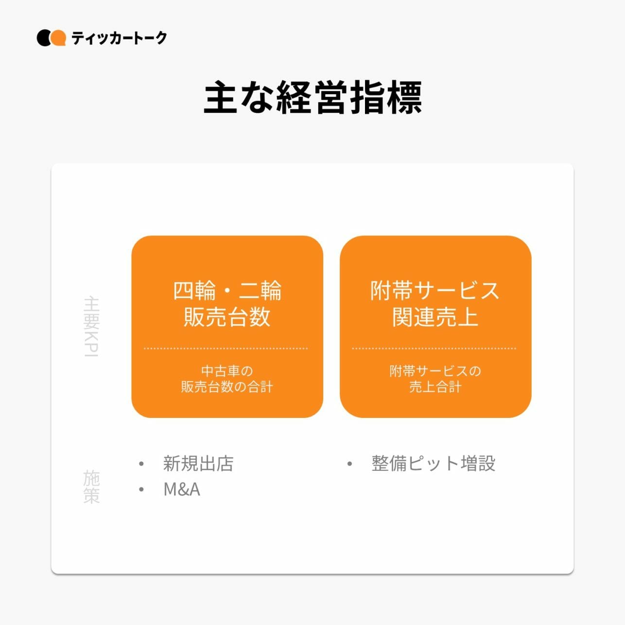 主力事業となる四輪中古車販売のシェア拡大と顧客の囲い込みを推進しつつ企業としてのブランド価値を高めチャンネル拡大新サービス投入などに積極的にチャレンジし大きな成長を目指すとしている
