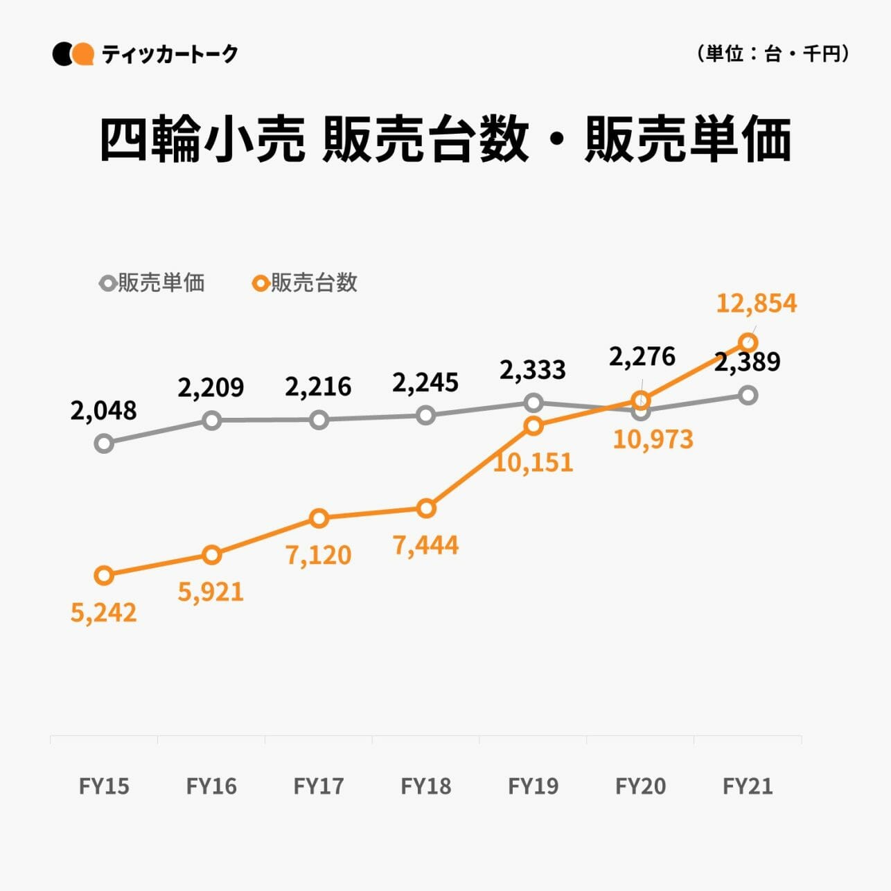 直近の実績では販売単価は2,200~2,300千円台で安定しており主に販売台数の伸長によって業績を伸ばしてきている今後も新規出店やM&Aによって販売台数を伸ばすことがカギになる