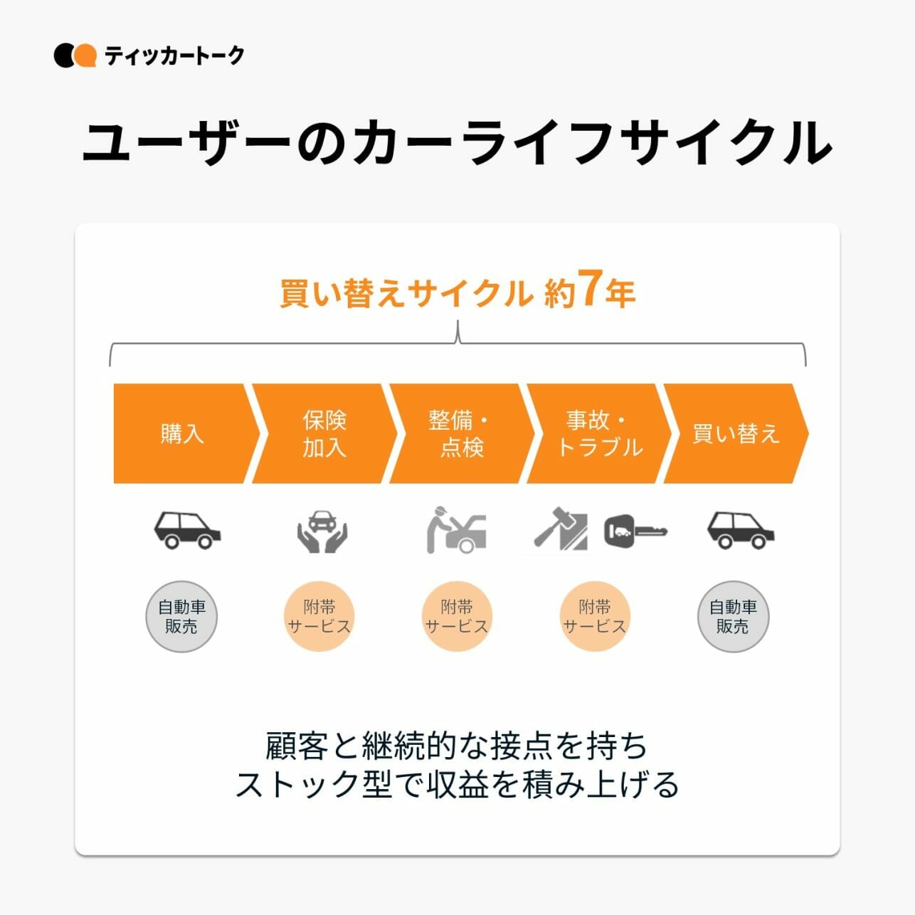 ユーザーのカーライフサイクルに寄り添い安心快適楽しいカーライフの提供を目指して附帯サービスを継続的に提供顧客と接点を持ちストック型で収益を積み上げるモデルを作っている