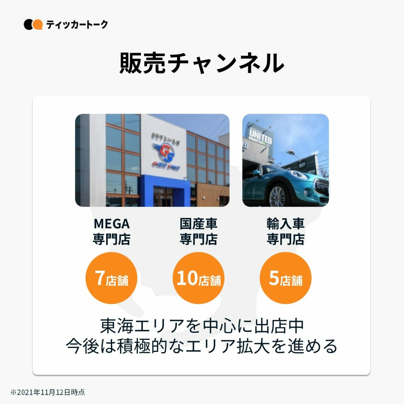 愛知県を中心に主に東海エリアに出店自動車の専門店は計22店舗20211112日時点を展開バイク専門店や買取専門店附帯サービス事業の店舗も含めると計73店舗を保有しているFY21期末実績併設店含む