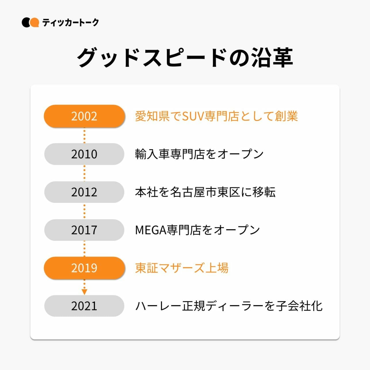 株式会社グッドスピードは東海エリアを中心に中古車販売事業を行っている企業特にSUV特化型の専門店に強みがあり新車販売や買取保険車検整備鈑金塗装といったアフターサービスにも事業を展開している