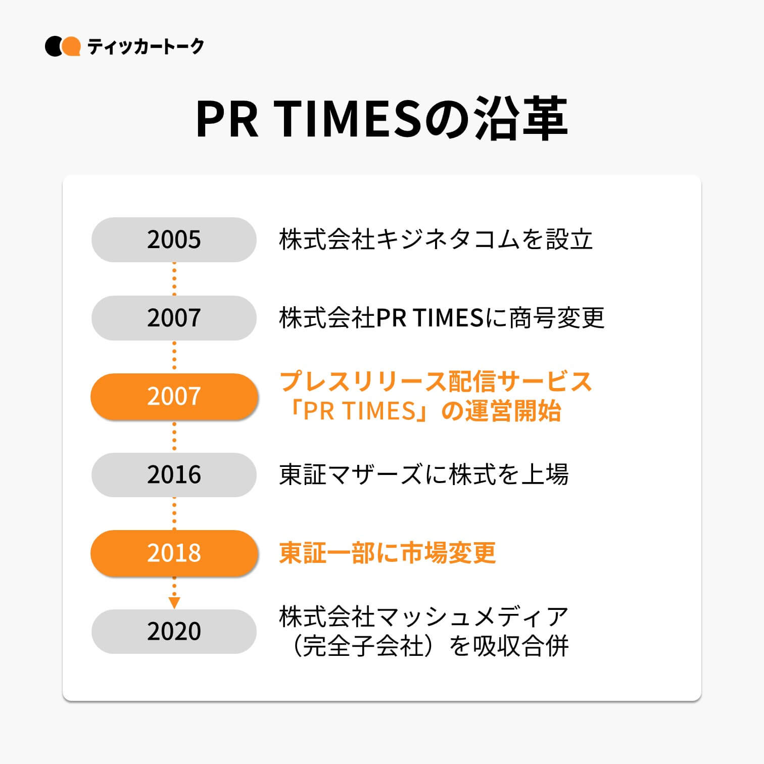 2005年に株式会社キジタネコムとして創業。2007年に商号を株式会社PR TIMESとし、プレスリリース配信サービスの「PR TIMES」を運営開始。9年後の2016年に東証マザーズに上場、その2年後の2018年に東証一部に市場変更。