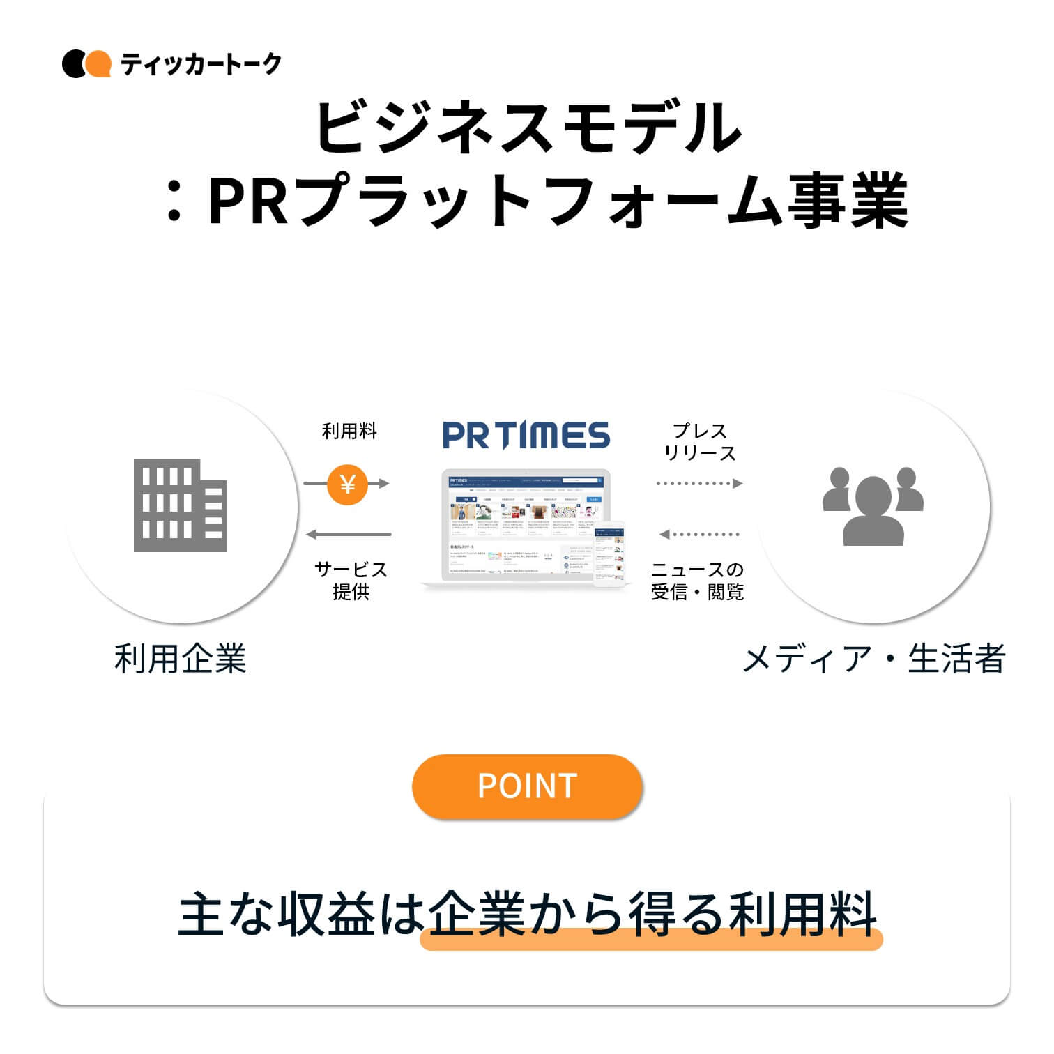収益の柱であるPRプラットフォーム事業では、企業とメディア、そして生活者をニュースでつなぐプラットフォーム「PR TIMES」を運営。企業が主体的にプレスリリースを発信できるプラットフォームを提供し、企業から利用料を得る仕組み。