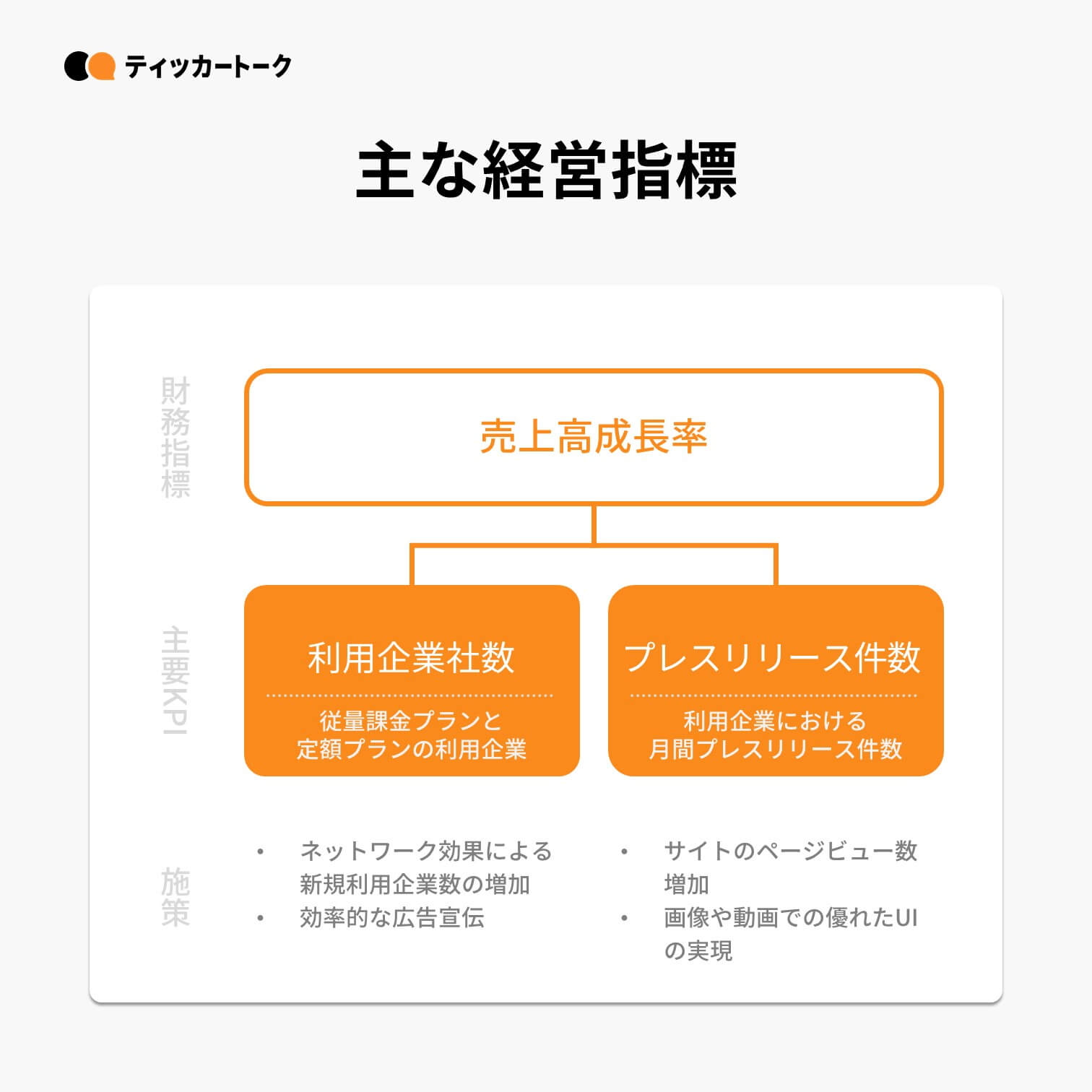 収益の主軸であるPRプラットフォームの成長に向けて、PR TIMESでは①利用企業社数と②プレスリリース件数を重要指標に位置付けている。利用企業を拡大させ、利用を促進し、生活者に効果的に届けることで、ネットワーク効果による継続的な安定成長を目指す。