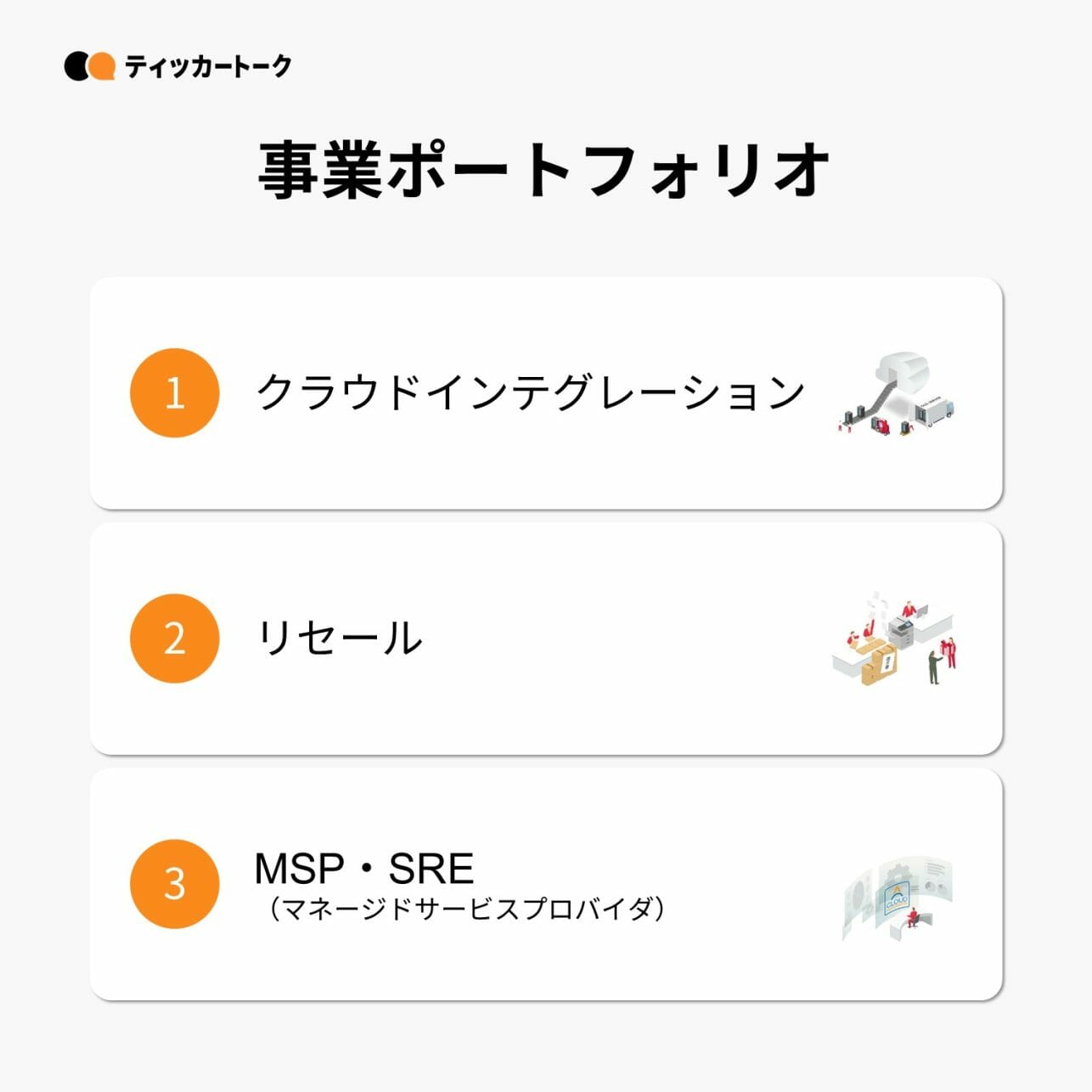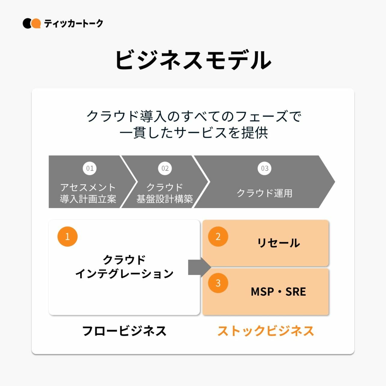 これらの事業は、顧客のクラウド導入のフェーズに対応している。クラウド計画立案・基盤構築を行う「クラウドインテグレーション」にはじまり、運用フェーズではシステムの監視・障害発生時の復旧対応を請け負う「MSP・SRE」、AWS利用料の支払いには「リセール」が対応しており、クラウドにおいて一貫したサービスを提供。クラウドインテグレーションで獲得した顧客が、リセールやMSP・SREの顧客に移行してストックが積みあがるモデルになっている。