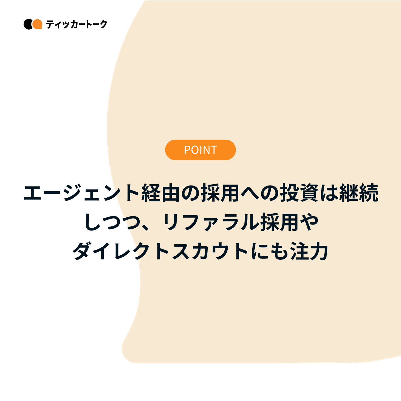 決算で開示している通り、かなりの採用費を人材エージェントに支払っているので、ここを圧縮すればかなりのインパクトがあります。ただ、中長期な人材確保という意味ではエージェントを全く使わないのも良い選択ではないので、そこへの投資は継続していきたいと考えています。 人材採用費を開示している上場企業は少ないので他社比較は難しいですが、一般水準より高い認識はあるので、そこの改善のためにリファラルやダイレクトスカウトなど他チャネルの強化にも取り組んでいます。