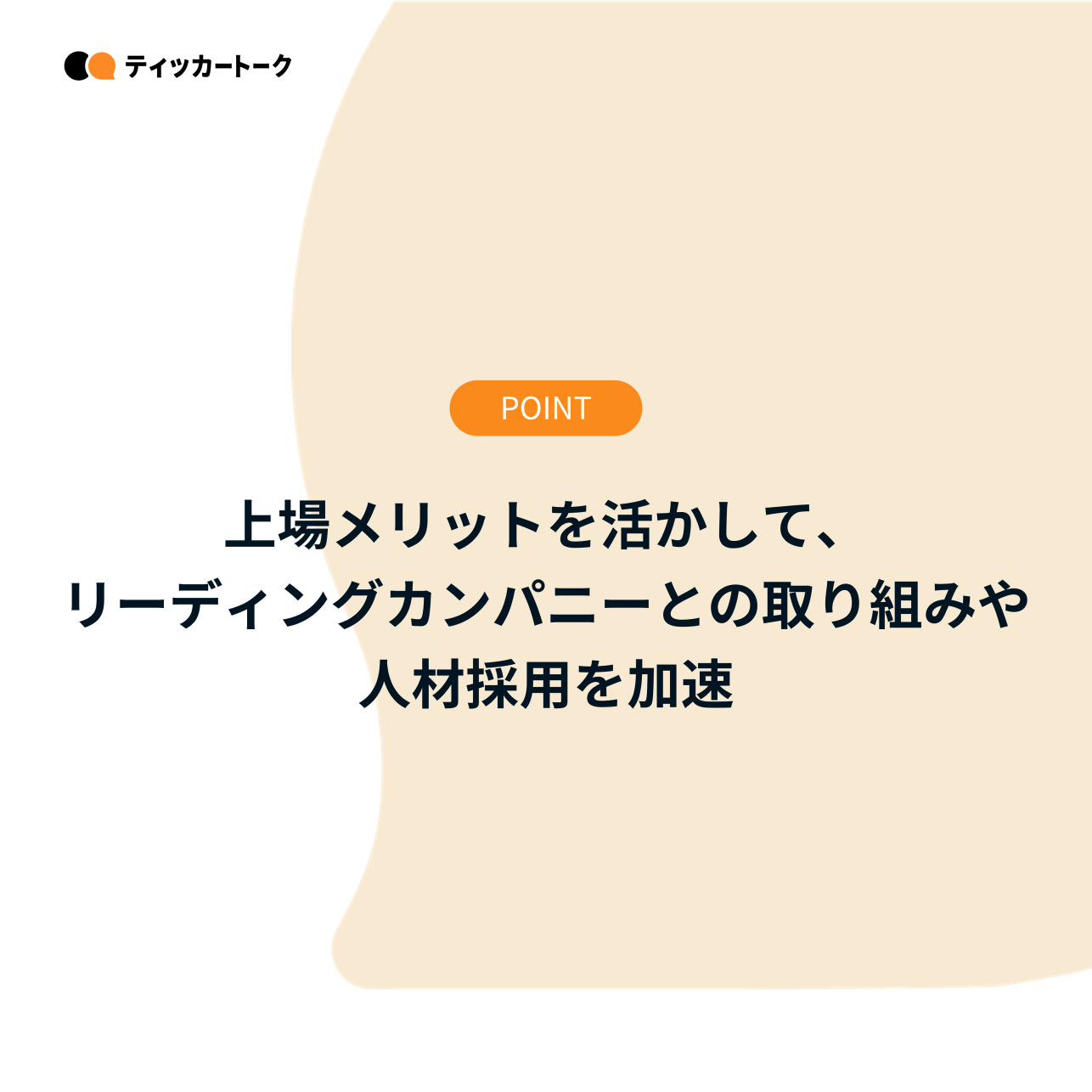 当社の掲げる「UPGRADE JAPAN」(≒日本をアップグレードする。)というミッションに共感して入社してくれた人材が多いので、その1つのマイルストーンとして上場を迎えることができたことは皆喜ばしく思っています。実際にやっていくことが変わるわけではないですが、上場企業という信頼を活かして、各業界のリーディングカンパニーとの取り組みや、優秀な人材の採用強化なども更に進めていきたい考えです。 また、ストックオプションを持っているメンバーも多いので、株価や決算発表など含めてメンバーの経営目線が高まった点についてはポジティブな影響だと感じています。