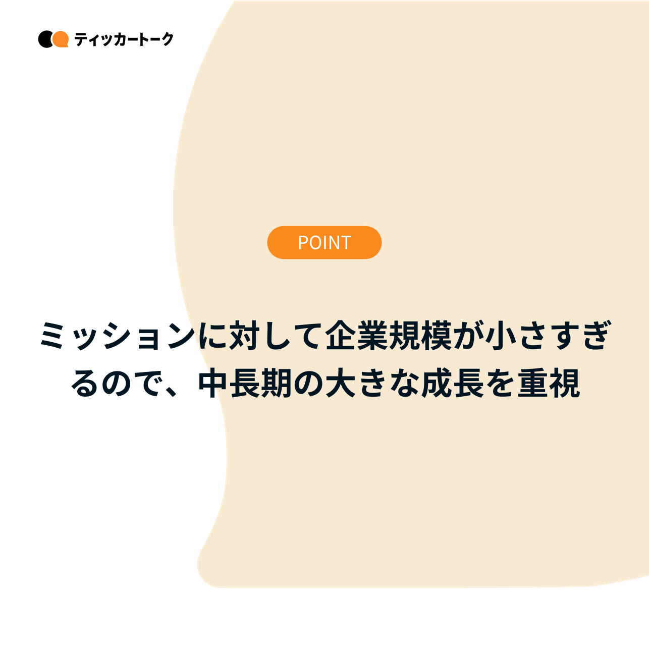 当社のミッションに対して、現状の顧客数や売上規模は小さすぎるので、会社としてはまだまだグロースのフェイズにあると考えています。短期的に開示している業績計画は上場企業として当然取り組んでいきますが、大方針としては、それ以上に中長期的な先行投資・人材投資を通して、より大きな会社の成長を目指していきます。