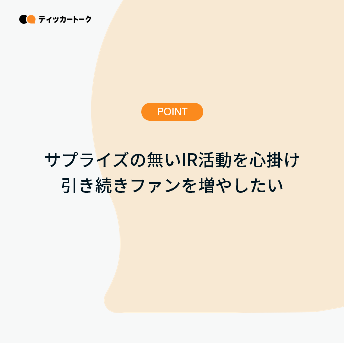 個人投資家さんを中心に、会社のファンを増やすことを念頭にしています。当社のようなBtoBの黒子企業だとIR活動をしっかり行わないと誰にも気づいてもらえないので、時間が許す限り積極的に取り組んだ方が良いと考えています。また、IRは営業活動も兼ねていると思っていて、ブランドイメージが上がると、受注率も2~3%くらい上がるイメージはあります。