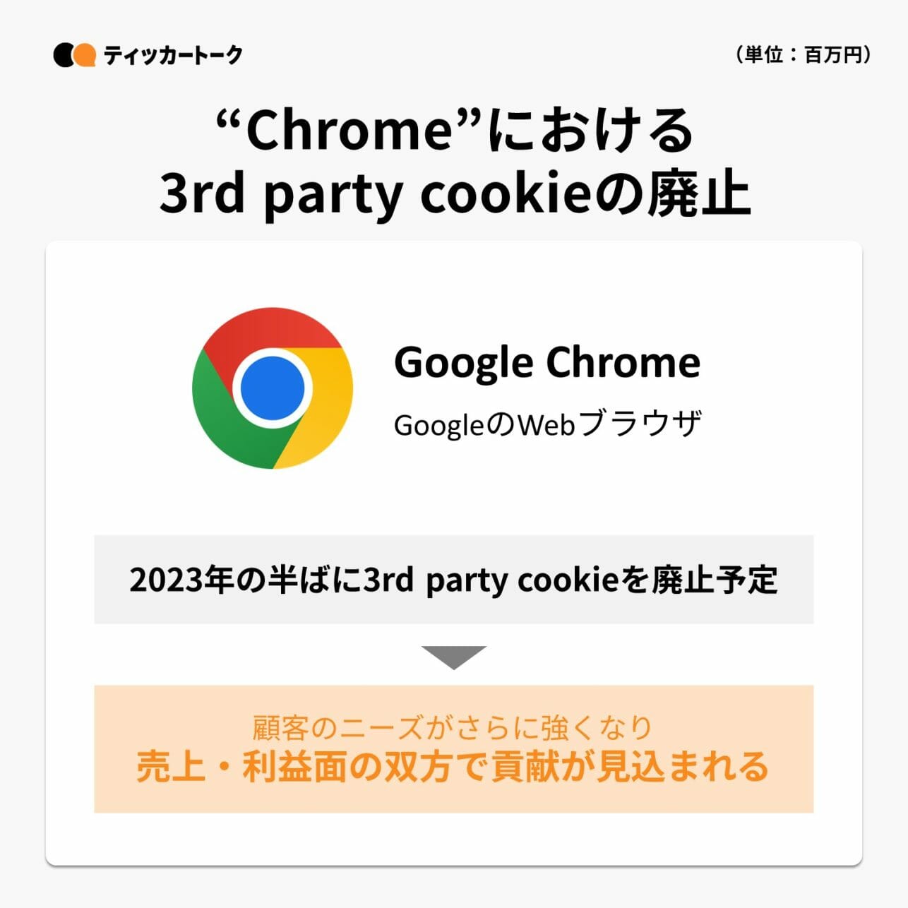 ポストCookieソリューションの提案は継続的に進めていますが、Googleのwebブラウザの”Chrome”における3rd party cookieの廃止が予定されている2023年の半ばには、お客様のニーズがさらに強くなり、売上・利益面の双方で貢献を見込んでいます。