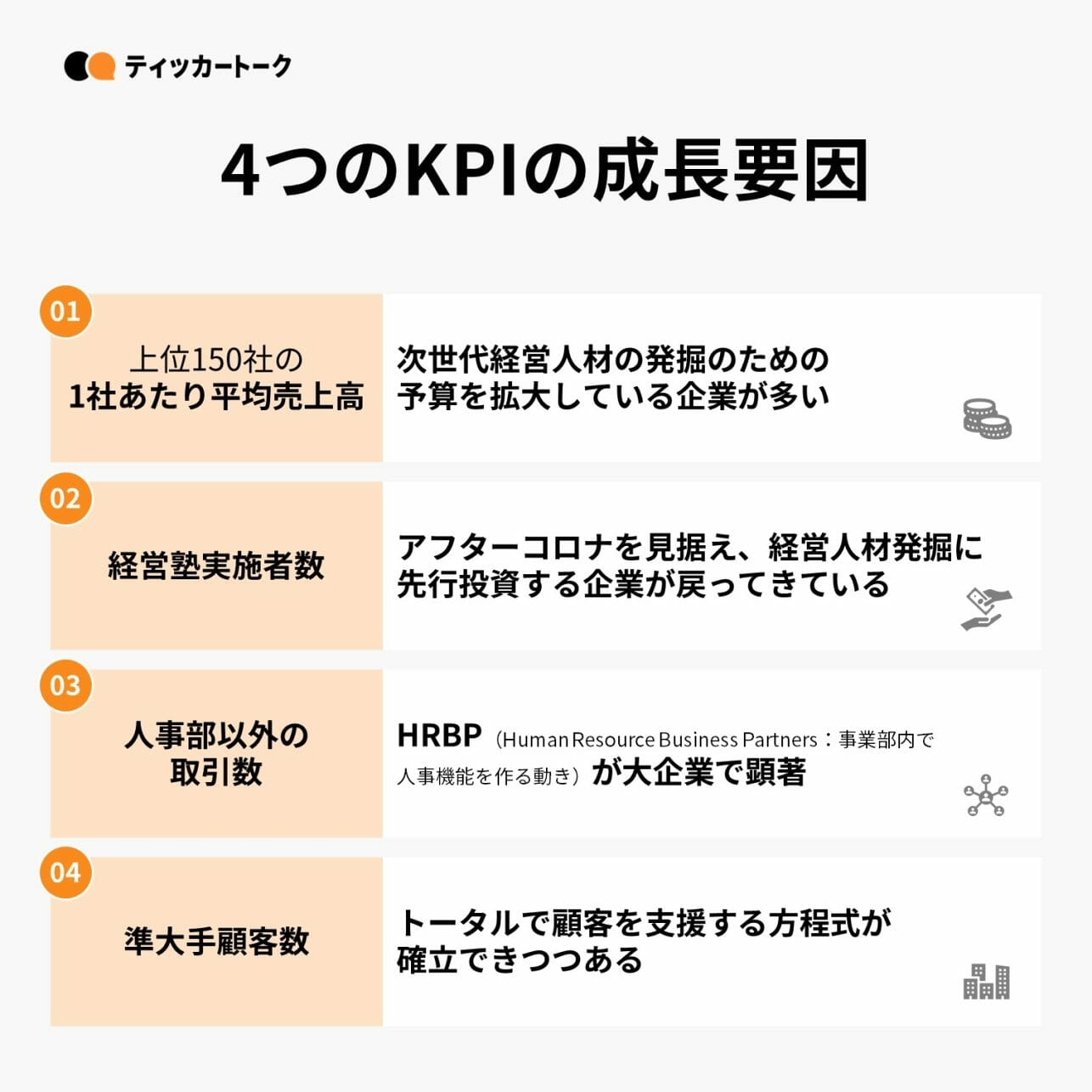 ここがメインで拡大しています。特に弊社は日本にある売上1兆円超の上場企業(約140社)の過半と取引関係を持っており、ガバナンス強化から派生する次世代経営人材に関する取り組みが増えています。また、この追い風は今後も強く続くトレンドだと考えています。