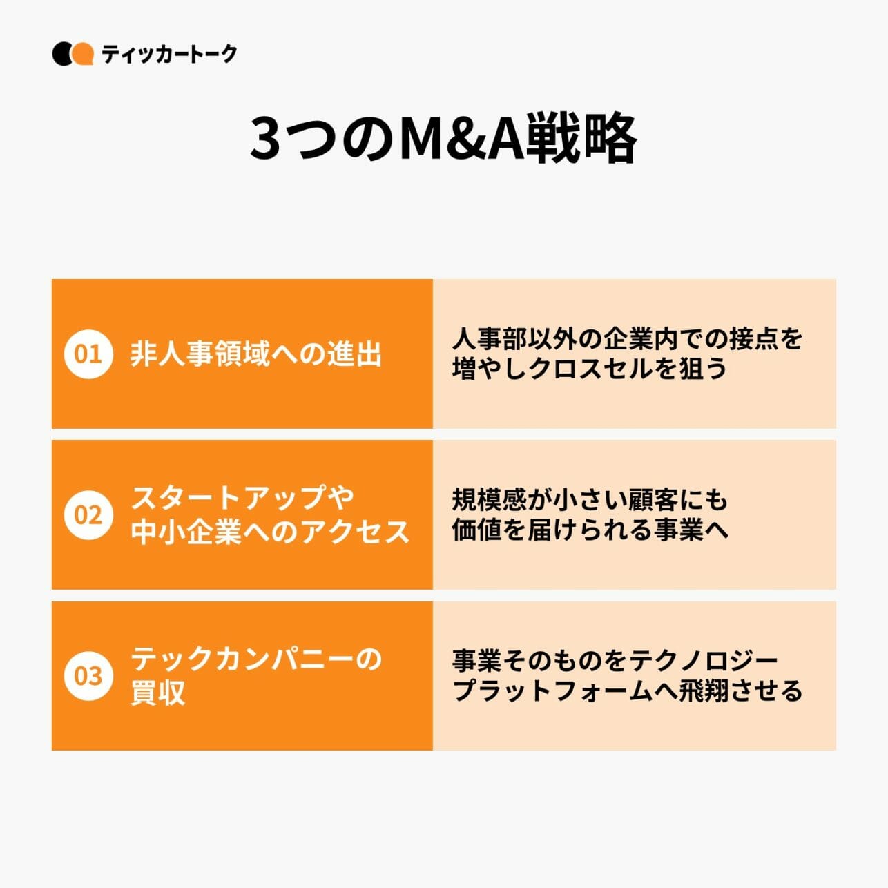 M&A戦略としては大きく3つです。ひとつが非人事領域への進出で、我々の既存事業の対面窓口が人事部のお客様となることが多く、これ以外の企業内での接点を増やすことでクロスセルを実現したいと考えています。二つ目がスタートアップや中小企業へのアクセスで、現在の大企業を中心にした顧客ポートフォリオだけでなく、より規模感が小さい顧客にもしっかり価値を届けられる事業を作りたいと考えています。最後に弊社事業そのものをテクノロジープラットフォームへ飛翔させるような、テックカンパニーの買収です。テクノロジーを駆使して1,400名超のタレントと顧客企業のナレッジを事業化できればと考えており、そこを加速させるようなM&Aを意図しています。