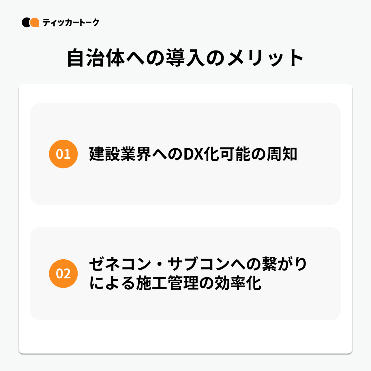 自治体が導入したことによるメリットとしていくつかあります。 1つ目は、自治体での活用が広がることで書面の多い行政業務の施設管理等についてデジタルシフトを推進でき、より多くのお客様の課題解決に貢献できます。 2つ目は、施設管理業務の割合が一定ある自治体で活用いただくことで、建設時だけでなく、竣工後の施設管理の場面(いわゆるメンテナンス業務)でもSPIDERPLUSが利用いただける可能性が広がることです。施設管理だけでなくインフラ工事での利用も将来的には想定されます。 3つ目は、施主(自治体)でのご利用により、施主と施工者(ゼネコン・サブコン等)と繋がり、施工管理がより効率化することが可能になるということです。