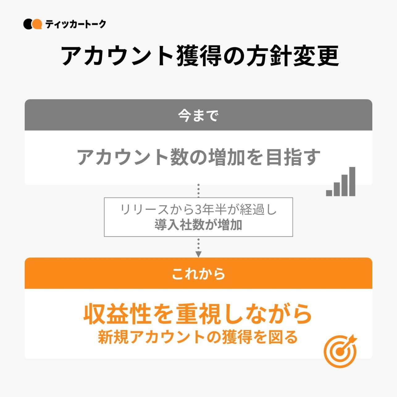 弊社のサービスをご利用いただく足掛かりとして、まずはアカウント数の増加を重要指標として展開してきましたが、リリースから3年半が経過し導入社数としてはかなり大きくなってきたため、今後は収益性を重視しながら新規アカウントの獲得を図る方針です。