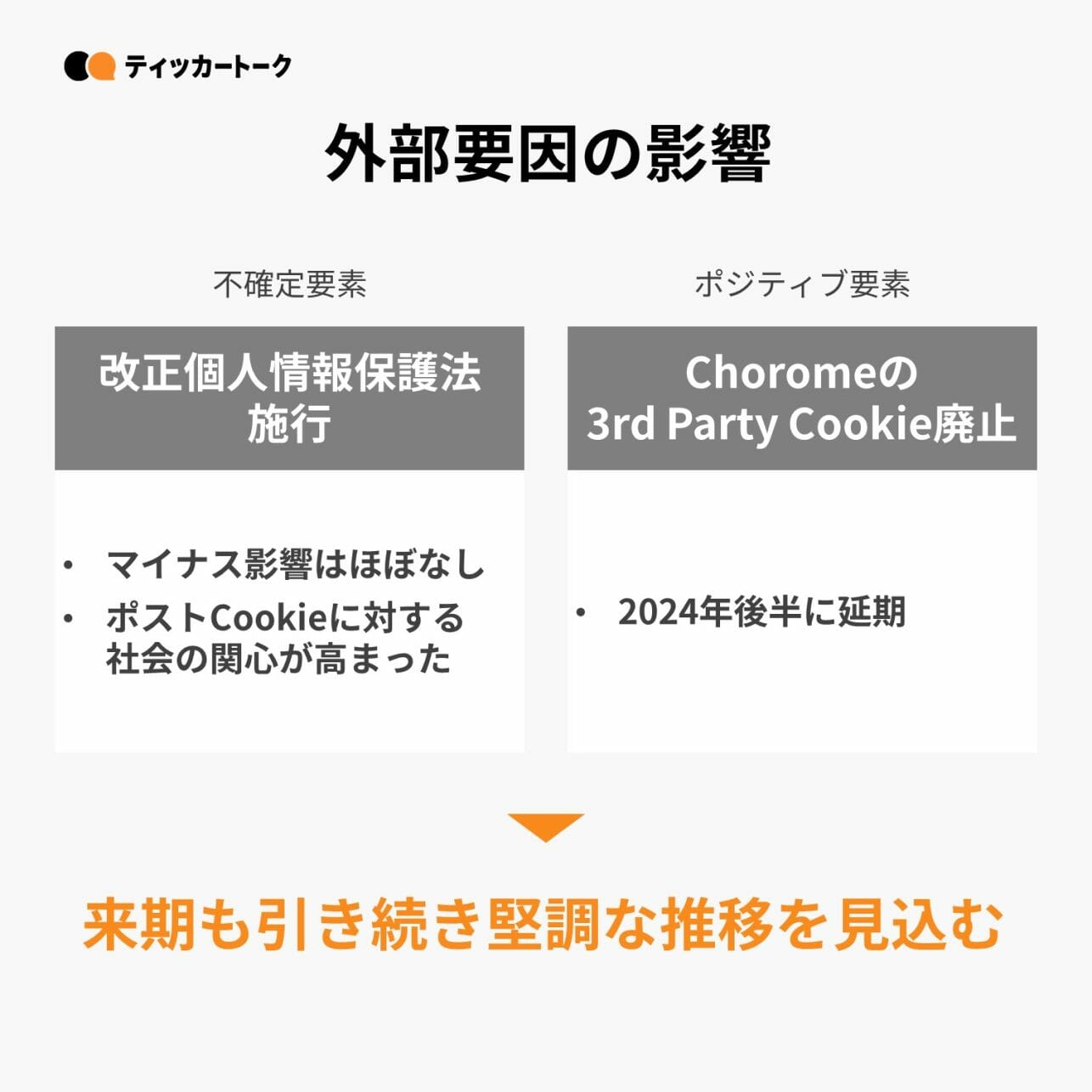 当初業績予想作成時には、2022年4月の改正個人情報保護法施行による影響を想定しづらい部分がありましたが、当社サービス提供上マイナスの影響はほぼなく、ポストCookieに対する社会の関心も大きく高まったことで、順調に案件の獲得が進んでいます。 Google社によるChoromeの3rd Party Cookie廃止は2024年後半に延期されましたが、その影響がなくても3rd Party Cookieを利用したデータが取得しづらくなる傾向に変わりはないので、来期も引き続き堅調に引き合いを頂けるものと考えています。