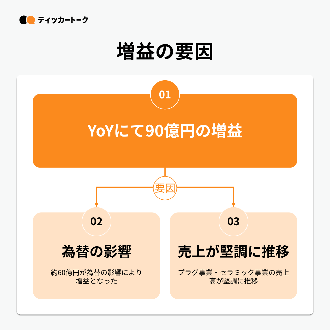 今回の決算は、YoY・QoQどちらの視点で見ても為替の変動が利益に対して影響しました。YoYで見ると100億円程の増益の内訳として、約60億円分が為替の影響で増益となりました。一方で為替の影響を抜いてもプラグ事業・セラミック事業は増益になっており、堅調に売上が増加したという点が事業の強さとして現れた決算内容となりました。