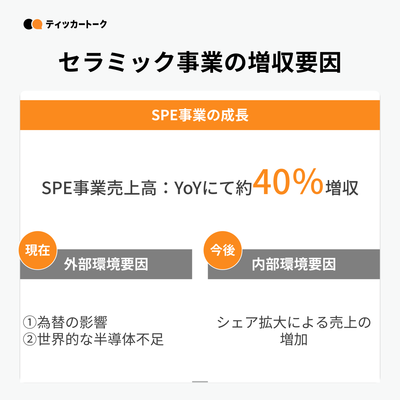 SPE事業の売上がYoYで約40%の増収となっており、SPE事業の貢献が一番の要因となります。こちらは自動車事業ほど為替の影響は受けておらず、28億円の増収のうち、半分以下の影響に留まります。現在は半導体市場が非常に強いため、そういった外部環境の影響を受けている点が増収の大きな要因となります。 来期になると半導体不足が改善していく中で、シェアの拡大して売上を伸ばすという取り組みが必要になると考えています。