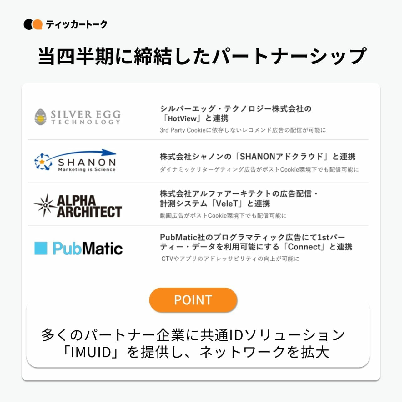 アドテク領域においては、当社の既存顧客に対してクロスセルができるソリューションを提供しているパートナーを中心に提携を広げております。