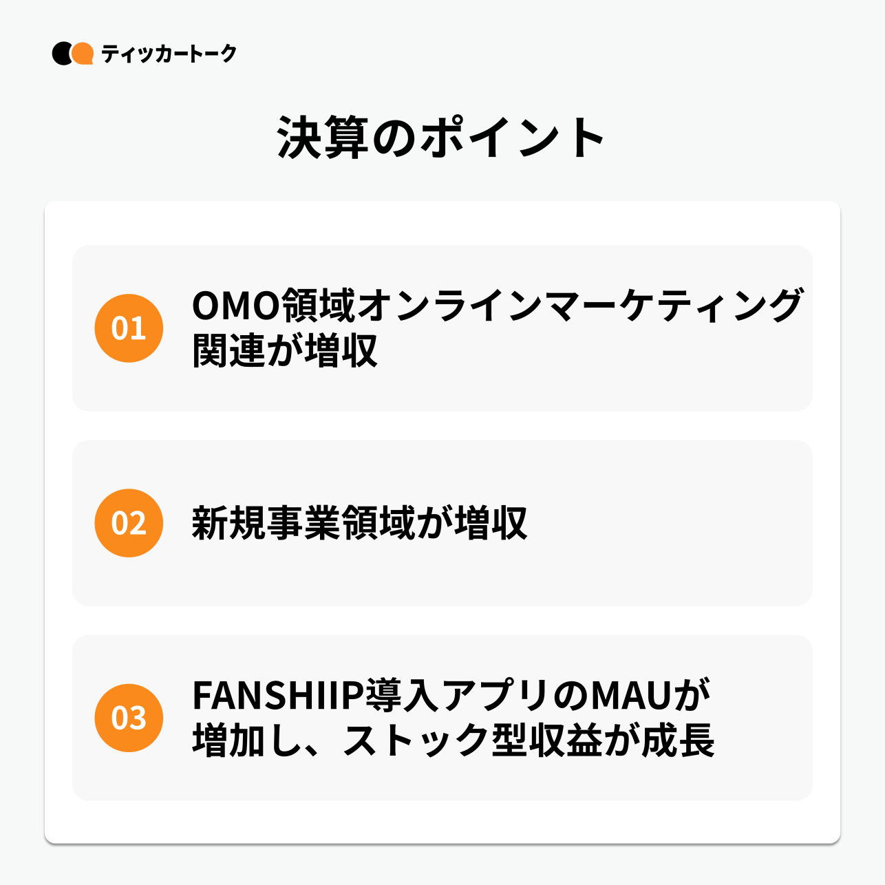 OMO領域オンラインマーケティング関連及び新規事業領域で増収となり,Q2単独は黒字となりました。また、FANSHIP導入アプリのMAUが増加したことなどによりQ2のストック型収益はYoYにて+17.9%と順調に推移、OMO領域オフラインマーケティング関連は、新型コロナウイルス感染症の影響もあり、新規顧客獲得が遅延し減収となりました。